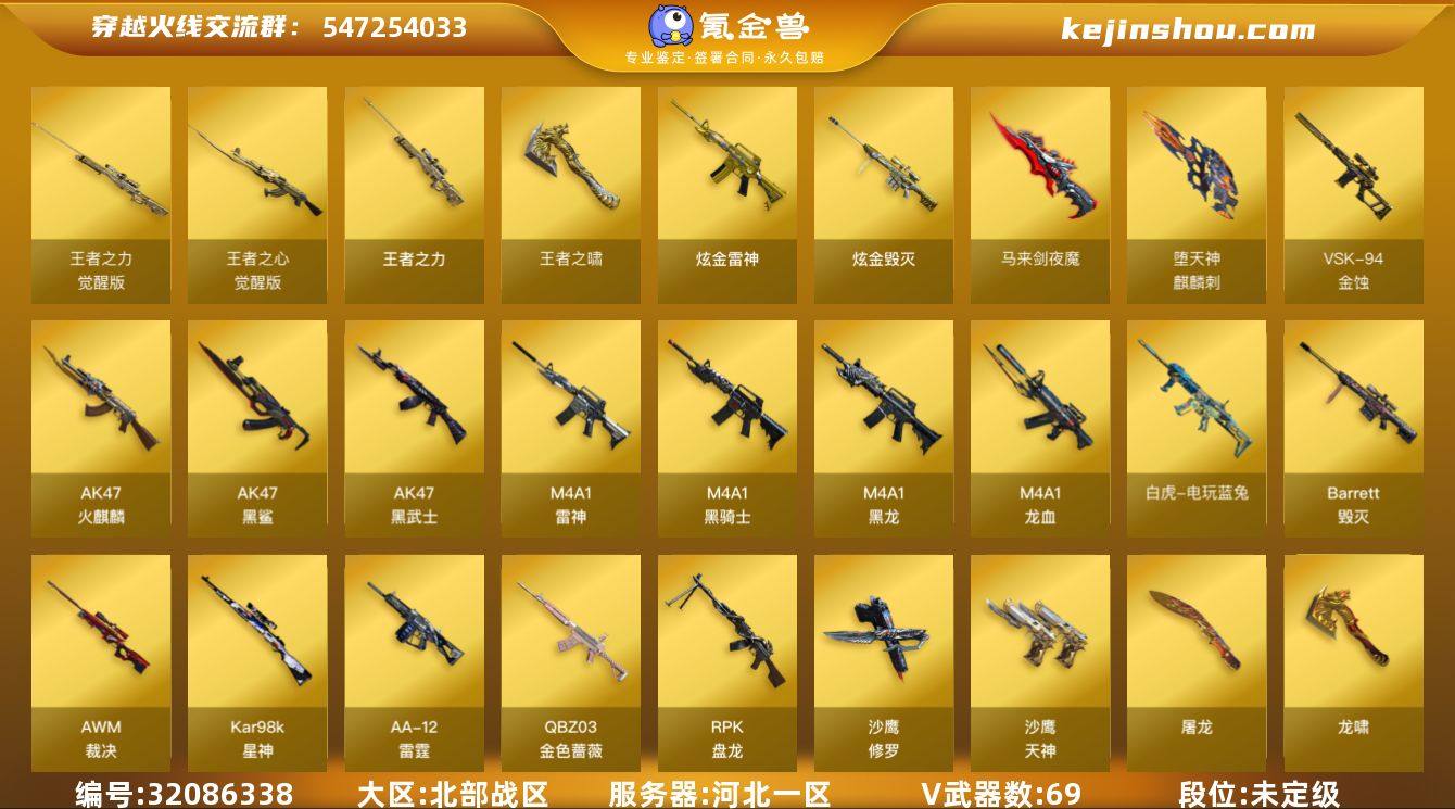河北一区-74V-6王者-3炫金 【热门武器】:QBZ03-金色蔷薇,死亡之眼,荣耀世冠-火麒麟,白虎-电玩蓝兔,Kar98K-星神,M4A1-黑骑士,RPK-盘龙*4,加特林-炼狱,沙鹰-修罗 【王者炫金武器】:王者之力,王者之啸,炫金雷神,炫金武士,炫金毁灭 【音效卡】:AK47-火麒麟音效卡,M4A1-雷神音效卡,M4A1-黑骑士音效卡,Barrett-毁灭音效卡,QBZ03-天罚音效卡,Barrett-碧霄极光音效卡,炼狱-百战金芒-庆典舞曲音效卡 【皮肤】:QBZ03-荣耀世冠EP 皮肤,AWM-裁决-凤灵皮肤,雷神-暗月,雷神-荣耀之魄,雷神-虎将*2,M4A1-再燃火线,雷神-神秘按键 皮肤,AK47-火麒麟-传奇EVEN,火麒麟-战神关羽,黑龙-能量核心,黑骑士-暗月*2,AK47-黑武士-361,战神-紫绶金章皮肤*3,AWM-天龙-传奇70KG,修罗-能量核心,屠龙-巅峰荣耀 皮肤,轻型军用手斧-再燃火线 【角色】:樱,机械姬,妮妮,王者炽天使,乔伊教练,修道士,初恋灵狐,卡塔琳娜,猎狐者-追月,灵狐-花神,灵狐者-黄金海岸,潘多拉-X,潘多拉-甜心教官,铁骑荣耀,影武者-X 【人偶武器】:AWM-灵狐-15周年嘉年华,迷你波特博士*2,迷你火种,迷你生化手雷*3,生化手雷-机甲核心 【暴走生化】:异变清道夫,KAC-狂怒咆哮,黑龙吞噬者,双面神,死亡之眼 【挑战大师】:激光毁灭者III,机甲撕裂者III 【英雄级武器】:AK47-火麒麟,M4A1-黑龙,M4A1-雷神*2,M4A1-黑骑士,AK47-黑武士,AK47-黑鲨,M4A1-龙血,QBZ03-天罚,QBZ03-独角-III,QBZ03-金色蔷薇,烈火-动感闪耀,王者之心-觉醒版,王者之戮-觉醒版,AK-47-猩红传说*3,白虎-电玩蓝兔,荣耀世冠-火麒麟,Barrett-毁灭,AWM-裁决,Kar98K-星神,VSK-94-金蚀,RPK-盘龙*4,加特林-炼狱,炼狱-百战金芒,炼狱-悦蓝-觉醒版,AA-12-雷霆,沙鹰-修罗,沙鹰-天神,柯尔特-荣耀世冠EP,天神-动感