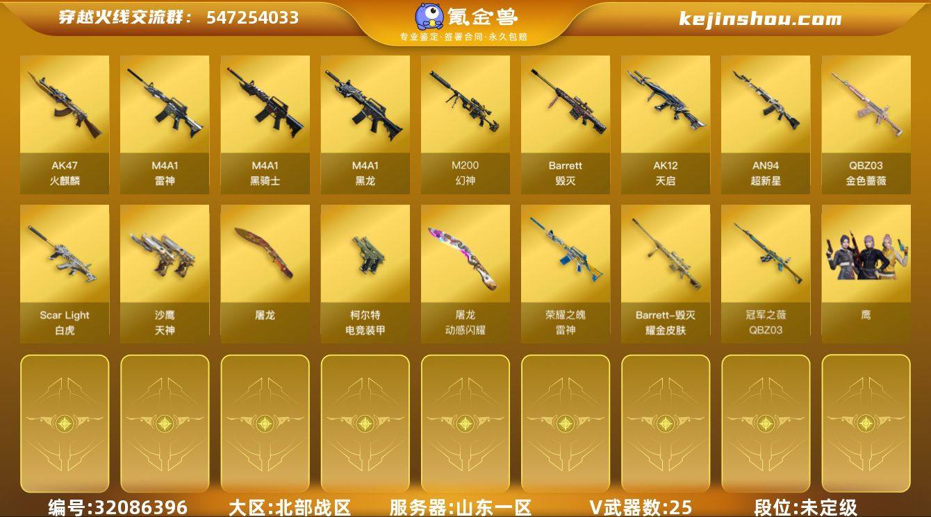山东一区-27V-1王者武器数-0炫金武器数 【热门武器】:QBZ03-金色蔷薇,Scar Light-白虎,M200-幻神,M4A1-黑骑士 【音效卡】:M4A1-黑骑士音效卡,Barrett-碧霄极光音效卡*2 【皮肤】:幻神-宠儿-2021MVP,M200-幻神-N9-2022MVP,幻神-星耀 皮肤,幻神-星火小队签名臻藏版 皮肤,QBZ03-冠军之薇,雷神-荣耀之魄,毁灭耀金皮肤,屠龙-惊鸿 皮肤 【角色】:鹰,暗夜-X,初恋灵狐,芳心审判者,风暴女,荆棘玫瑰,娟娟,灵狐者-X,曼陀罗-X,蛇姬,铁骑荣耀 【人偶武器】:M4A1-雷神-精英刀锋,生化手雷-机甲核心 【暴走生化】:超级对讲机 【英雄级武器】:AK47-火麒麟,M4A1-黑龙,M4A1-雷神,M4A1-黑骑士,AK12-天启,AN94-超新星,Scar Light-白虎,QBZ03-金色蔷薇,Barrett-毁灭,M200-幻神,王者星神-觉醒版,沙鹰-天神,柯尔特-电竞装甲,屠龙,高爆手雷-竞技荣光*3,闪光弹-雷霆,闪光弹-竞技荣光*2,烟雾弹-古蛇迷踪,Barrett-碧霄极光 【道具】:BS战队炫彩背包,CFS限定背包,EP战队炫彩背包,亚洲杯纪念炫彩背包,炫彩背包-诺拉,虎牙炫彩背包,迷你冰龙背包,哔哩哔哩名片,女皇终结者-魔龙之吻,救世主-黑桃战神,黄金生化钩,绿色巨人,灵魂忍者*2,变异宝贝,迷雾幽灵*2,夺命之镰,防化服*3,流光-鎏金之域,流光-再燃火线,枪王排位28赛季金色流光,枪王排位29赛季金色流光,循环实验表情,EP战队名片,EP战队喷图,防弹头盔*3,防弹衣*3,C4工具钳*3,手雷包*3 【特殊枪械】:1白虎,1黑骑士