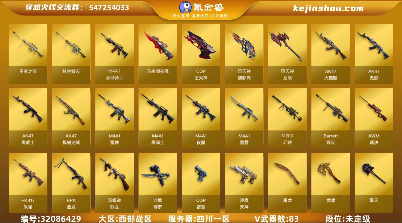 四川一区-88V-4王者武器数-1炫金武器数 【热门武器】:HK417-朱雀,M200-幻神*2,死亡之眼,荣耀世冠-火麒麟,荣耀世冠-柯尔特,M4A1-黑骑士,汤姆逊-烈龙*6,RPK-盘龙*4,加特林-炼狱*3,羊驼玩偶,降世魔童,COP-堕天神*3,沙鹰-修罗 【王者炫金武器】:王者之怒,炫金毁灭 【音效卡】:AK47-火麒麟音效卡,M4A1-雷神音效卡,M4A1-黑骑士音效卡,Barrett-毁灭音效卡 【皮肤】:幻神-冠军之幻,雷神-星空,火麒麟-心动糖果,毁灭-星空,毁灭-冠军之怒,无影耀金皮肤,AK47-黑武士-361,战神-流金岁月皮肤 【角色】:零,炫,初恋灵狐,风暴女,嘉年华灵狐,灵狐者-黄金海岸,麻雀,蛇姬,铁骑荣耀,新娜塔莎 【人偶武器】:M4A1-雷神-精英刀锋,海滩汪汪-巴雷特,迷你深渊冰龙*2,降世魔童 【暴走生化】:死亡之眼,超级对讲机 【挑战大师】:AK47-冰龙粉碎者,VEPR-12-金魔,激光毁灭者III*2,阐释者III 【英雄级武器】:AK47-火麒麟,M4A1-雷神,M4A1-黑骑士,AK47-无影,AK47-黑武士,AK47-机械迷城,M4A1-雷霆,HK417-朱雀,M4A1-夜魔*2,王者之武-觉醒版,王者之势-觉醒版,王者之幻-觉醒版,荣耀世冠-火麒麟,Barrett-毁灭,AWM-裁决,M200-幻神*2,RPK-盘龙*4,加特林-炼狱*3,汤姆逊-烈龙*6,沙鹰-修罗,沙鹰-天神,COP-雷霆,COP-堕天神*3,柯尔特-电竞装甲,荣耀世冠-柯尔特,破空枪刃-夜魔,屠龙,龙啸,麒麟刺-堕天神,马来剑-夜魔,擎天*2,龙啸-堕天神,高爆手雷-雷霆*5,高爆手雷-堕天神*2,高爆手雷-夜魔*5,闪光弹-雷霆*4,闪光弹-堕天神*2,闪光弹-夜魔*5,烟雾弹-雷霆*4,烟雾弹-堕天神*2,烟雾弹-夜魔*5,M4A1-赤狱骑士 【道具】:古蛇迷踪炫彩背包,炫彩背包,超级背包,救世主-黑桃战神,生化弹匣,夺命之镰,防化服,金色流光-枪王排位*2,星辰流光-枪王排位,枪王排位28赛季金色流光,枪...