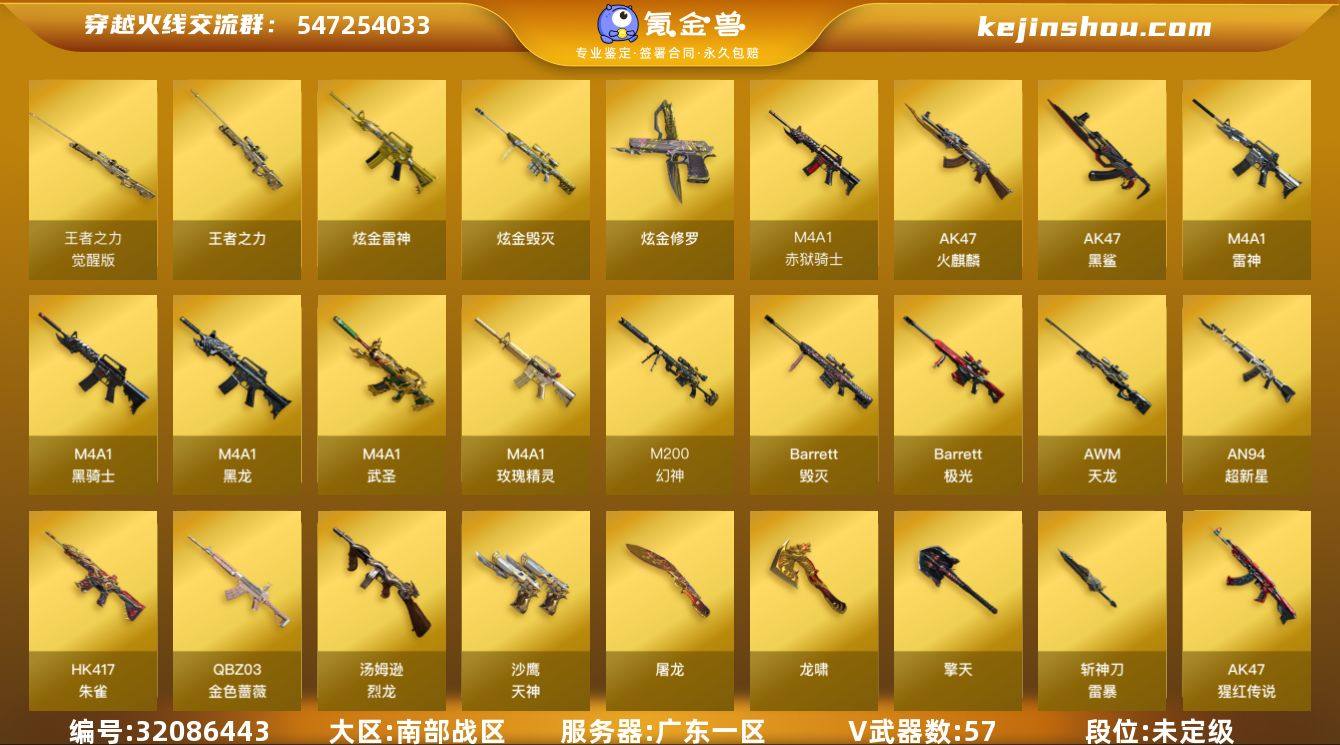 广东一区-62V-4王者武器数-3炫金武器数 【热门武器】:QBZ03-金色蔷薇*3,HK417-朱雀,M200-幻神,M4A1-黑骑士*2,汤姆逊-烈龙*2,Knife-冠军之刃 【王者炫金武器】:王者之力,炫金雷神,炫金毁灭,炫金修罗 【皮肤】:M200-幻神-黄忠皮肤,幻神-冠军之幻,幻神-荣耀世冠EP 皮肤,QBZ03-荣耀世冠白鲨,QBZ03-巅峰荣耀皮肤,QBZ03-荣耀世冠EP 皮肤,烈龙-星空,雷神-荣耀之魄,雷神-星空,雷神-虎将,雷神-维纳斯皮肤,火麒麟-华夏之心,火麒麟-平天大圣,毁灭-星空*2,毁灭-冠军之怒,黑骑士-AG-S4冠军典藏,黑骑士-破浪10年皮肤,无影耀金皮肤,修罗-能量核心*2 【角色】:葵,妮妮,王者凌霄,乔伊教练,初恋灵狐,电竞少女,芳心审判者,风暴女,兰-海滩派对,灵动武士,灵狐-花神,灵狐者-X,灵狐者-职业经理,曼陀罗-礼服,铁骑荣耀,维纳斯,幽,游珑儿 【人偶武器】:白虎-迷你小艾 【挑战大师】:神圣爆裂者III,激光毁灭者III 【英雄级武器】:AK47-火麒麟,M4A1-黑龙*3,M4A1-雷神*2,M4A1-黑骑士*2,AN94-超新星*2,M4A1-武圣*2,AK47-黑鲨,HK417-朱雀,M4A1-玫瑰精灵,QBZ03-金色蔷薇*3,烈火-动感闪耀,AK-47-猩红传说,王者白虎-觉醒版,王者芳薇-觉醒版,AWM-天龙,Barrett-毁灭,Barrett-极光,M200-幻神,王者之力-觉醒版,汤姆逊-烈龙*2,沙鹰-天神*5,天神-动感闪耀,屠龙*3,龙啸*2,擎天,屠龙-动感闪耀,斩神刀-雷暴,高爆手雷-雷霆,高爆手雷-雷暴*2,手雷-动感闪耀,高爆手雷-云龙,闪光弹-雷霆,闪光弹-雷暴*2,闪光弹-云龙,烟雾弹-雷霆,烟雾弹-雷暴*2,烟雾弹-云龙,烟雾弹-荣耀世冠EP,M4A1-赤狱骑士 【道具】:炫彩背包,哔哩哔哩名片,女皇终结者-魔龙之吻,救世主-黑桃战神,绿色巨人,灵魂忍者,迷雾幽灵,夺命之镰,防化服*2,金色流光-枪王排位*2,星辰流光-枪王排位,流光-...