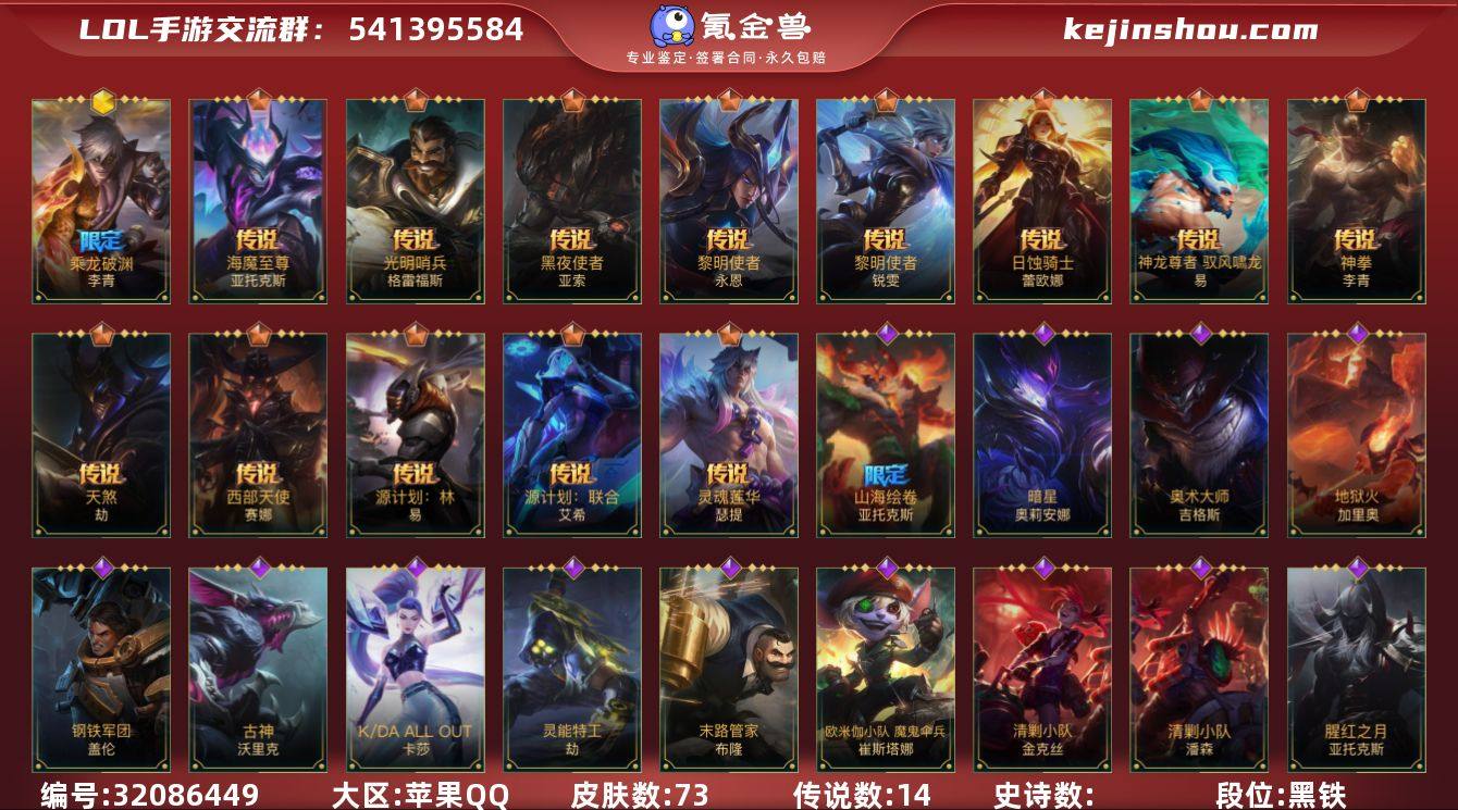 MLL1459【1神话 14传说】苹果Q-86英雄-73皮肤-14传说 段位:黑铁【神话】乘龙破渊李青【传说】西部天使赛娜 天煞劫 海魔至尊亚托克斯 战斗学院凯特琳 黑夜使者亚索 神拳李青 灵魂莲华瑟提 黎明使者锐雯 黎明使者永恩 源计划:联合艾希 源计划:林易 神龙尊者驭风啸龙易 日蚀骑士蕾欧娜 光明哨兵格雷福斯【皮肤】日蚀骑士蕾欧娜 黑夜使者亚索 黎明使者锐雯 神龙尊者 驭风啸龙 神拳盲僧 天煞劫 西部天使赛娜 黎明使者永恩 源计划:林 光明哨兵格雷福斯 灵魂莲华腕豪 清剿小队金克丝 末路管家 欧米伽小队 魔鬼伞兵 清剿小队潘森 古神狼人 宇航员泰坦 霸天剑魔亚托克斯 腥红之月剑魔 山海绘卷剑魔 K/DA ALL OUT卡莎 灵能特工劫 钢铁军团 暗星发条 奥术大师吉格斯 地狱火加里奥 s1光耀之刃 s6绯金丽刃 s7绯金战斧 s8绯金鮫灵 s9王牌舰长