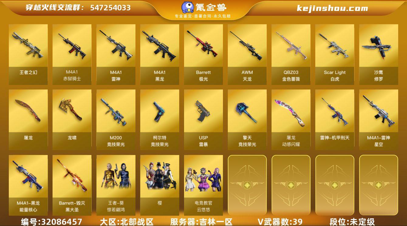 吉林一区-45V-5王者武器数-0炫金武器数 【热门武器】:QBZ03-金色蔷薇,Scar Light-白虎,M200-竞技荣光,USP-雷暴,沙鹰-修罗 【王者炫金武器】:王者之幻,悦蓝-惊涛骇浪 【音效卡】:Barrett-碧霄极光音效卡*2 【皮肤】:雷神-星空,雷神-机甲刑天皮肤,毁灭-黑大圣皮肤,黑龙-能量核心 【角色】:樱,电竞教官-云悠悠,王者葵-惊若翩鸿,蛇隐宗,奇洋探员,乔伊教练,修道士,云海玲珑,初恋灵狐,风暴女,零-水下丽影,潘多拉-X,潘多拉-甜心教官,蛇姬,樱-战斗天使 【人偶武器】:迷你宝贝,M4A1-蓝水晶-斯沃特精英,迷你裂空之翼,迷你波特博士,夺魂,迷你火种*2 【暴走生化】:超级对讲机 【挑战大师】:神圣爆裂者III,冰龙粉碎者-白马银枪,激光毁灭者III-白马银枪 【英雄级武器】:M4A1-黑龙,M4A1-雷神,Scar Light-白虎,QBZ03-金色蔷薇,王者之魄-觉醒版,超新星-悦享-觉醒版,AWM-天龙,Barrett-极光,M200-竞技荣光,王者星神-觉醒版,沙鹰-修罗,USP-雷暴,柯尔特-竞技荣光,屠龙,龙啸,擎天-竞技荣光,高爆手雷-竞技荣光*7,手雷-热带奇洋,闪光弹-竞技荣光*7,烟雾弹-竞技荣光*8,M4A1-赤狱骑士 【道具】:云山科技背包,奇洋探员-海龟背包,女皇终结者-背包,次元之矛-黄金背包,炫彩背包,背包-洛丽塔,超级背包,女皇终结者-魔龙之吻,救世主-黑桃战神,绿色巨人,灵魂忍者*2,迷雾幽灵,生化弹匣,夺命之镰,防化服*3,金色流光-枪王排位,星辰流光-枪王排位,流光-鎏金之域,枪王排位29赛季金色流光,云海游龙表情,防弹头盔*4,防弹衣*4,C4工具钳*4,手雷包*4 【特殊枪械】:1白虎