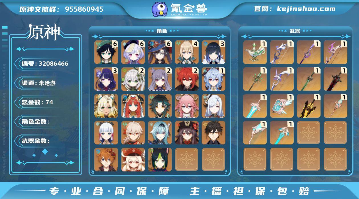 邮箱: 送网易邮箱 总黄数: 74 冒险等级: 60 6命金色角色: 满命温迪,满命七七,满命莫娜 4命金色角色: 四命琴 3命金色角色: 三命雷电将军,三命夜兰 2命金色角色: 二命迪卢克,二命刻晴,二命纳西妲 1命金色角色: 一命甘雨 0命金色角色: 枫原万叶,优菈,神里绫华,可莉,达达利亚,钟离,魈,胡桃,申鹤,八重神子,提纳里,妮露,希诺宁 1精武器: 狼的末路,天空之翼,飞雷之弦振,天空之卷,和璞鸢,阿莫斯之弓,天空之傲,天空之刃,无工之剑,天空之脊,磐岩结绿,薙草之稻光,若水,千夜浮梦