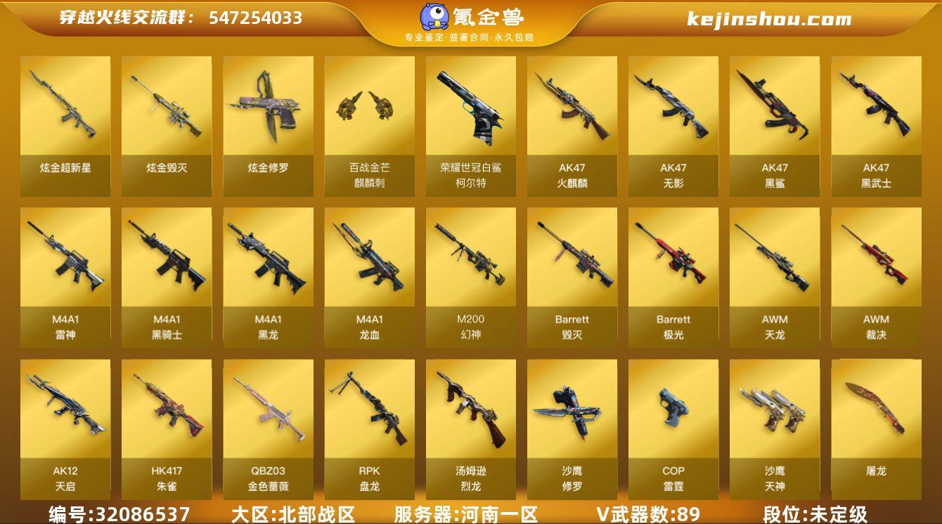 河南一区-90V-2王者-4炫金 【热门武器】:QBZ03-金色蔷薇,HK417-朱雀,M200-幻神,死亡之眼,荣耀世冠-柯尔特,M4A1-黑骑士*2,汤姆逊-烈龙*6,RPK-盘龙*4,加特林-炼狱*3,斯泰尔-蝴蝶,羊驼玩偶,火麒麟-绝迹,USP-雷暴,沙鹰-修罗*5,荣耀世冠-龙啸 【王者炫金武器】:炫金武士,炫金超新星,炫金毁灭,炫金修罗 【音效卡】:AK47-火麒麟音效卡,M4A1-雷神音效卡,M4A1-黑骑士音效卡,Barrett-毁灭音效卡 【皮肤】:幻神-冠军之幻,裁决-叶芒苍灵 皮肤,雷神-能量核心,雷神-荣耀之魄,雷神-星空,M4A1-战神赵云,火麒麟-雷神,AK47-火麒麟-传奇EVEN,火麒麟-平天大圣,毁灭-荣耀之怒,毁灭耀金皮肤*2,毁灭-冠军之怒,毁灭-CFS2020,毁灭-英雄计划 皮肤,黑龙-能量核心,黑骑士-CFS2021,战神-紫绶金章皮肤*2,战神-流金岁月皮肤*4,AK47-B-常胜将军-刘备,AK47-B-常胜将军-孙权*2,AWM-天龙-传奇70KG,AWM-天龙-传奇白鲨 【角色】:炫,王者-零-国色天香,王者-葵-貂蝉,狐影,炽天使,风暴女,兰-海滩派对,邱刚敖,蜀雪,铁骑-乘风破浪,影武者-X 【人偶武器】:火麒麟-绝迹,火麒麟-灵狐,M4A1-雷神-精英刀锋,斯泰尔-蝴蝶,M37-葵,迷你牛牛,迷你生化手雷,深渊终结者手雷,闪光弹-小乔,闪光弹-貂蝉,高爆手雷-大乔 【暴走生化】:死亡之眼 【挑战大师】:KAC-圣炎切割者III 【英雄级武器】:AK47-火麒麟,M4A1-黑龙*2,M4A1-雷神*2,M4A1-黑骑士*2,AK47-无影*3,AK47-黑武士,AK12-天启,AK47-黑鲨,M4A1-龙血,HK417-朱雀,QBZ03-金色蔷薇,AK-47-猩红传说,AK47-B-战神,AK47-B-常胜将军,AWM-天龙*3,Barrett-毁灭*2,Barrett-极光,AWM-裁决,M200-幻神,RPK-盘龙*4,加特林-炼狱*3,汤姆逊-烈龙*6,沙鹰-修罗*5,沙鹰-天神,USP-