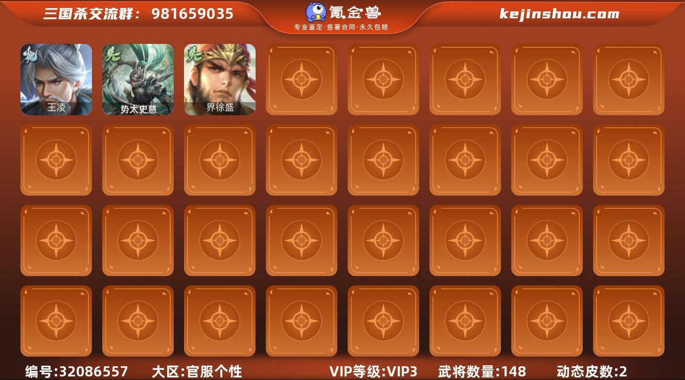 【49】官阶:先锋将军;VIP等级:VIP3;史诗武将数量:0;动态皮肤数量:2;武将总数:148;史诗宝珠数量:0;将魂数量:0;神将:0;魏国史诗武将:0;蜀国史诗武将:42;吴国史诗武将:35;群史诗武将:31 王凌,界司马懿,李典,界夏侯渊,曹真,韩浩史涣,诸葛诞,界夏侯惇,曹彰,文聘,钟会,界张辽,界曹操,司马朗,郭皇后,陈群,界王异,朱灵,崔琰,阮慧,钟繇,曹叡,曹冲,曹昂,SP姜维,SP关羽,邓艾,夏侯渊,甄姬,司马懿,许褚,夏侯惇,荀彧,郭嘉,荀攸,曹仁,曹丕,曹操,张辽,谋夏侯渊,马良,李严,界马超,关兴张苞,廖化,关平,法正,界张飞,界关兴张苞,简雍,周仓,SP徐庶,SP孙尚香,关银屏,糜夫人,界法正,黄皓,吴懿,糜竺,刘封,界刘备,张松,界关羽,杨仪,刘备,黄忠,姜维,孟获,霍峻,马超,庞统,马岱,诸葛亮,刘禅,魏延,张飞,祝融,关羽,黄月英,赵云,徐庶,势陈到,徐盛,孙权,界徐盛,界陆逊,孙鲁育,界大乔,界甘宁,界孙鲁班,界周瑜,孙鲁班,界黄盖,虞翻,朱然,诸葛瑾,韩当,程普,凌操,界孙权,孙亮,谋吕蒙,朱恒,孙策,黄盖,小乔,周瑜,凌统,孙坚,甘宁,张绍张弘,陆逊,大乔,孙尚香,吕蒙,周泰,势太史慈,李傕郭汜,张鲁,公孙渊,界吕布,伏皇后,SP黄月英,谋卢植,谍刘赪,界华佗,界袁术,蔡夫人,王濬,SP赵云,公孙瓒,刘繇,袁术,董白,华雄,伏完,颜良文丑,貂蝉,华佗,袁绍,张角,董卓,庞德,贾诩,潘凤,吕布,于吉,马腾,周处-义除三害(动态),徐盛-千军铸甲,界徐盛-千军铸甲,吕蒙-计韬武略,徐盛-勇烈却敌,界徐盛-勇烈却敌