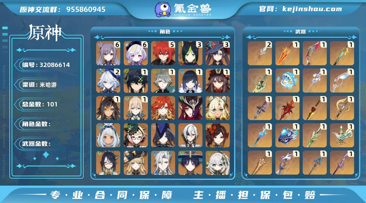 【原神】冒险等级:60,五星数量:69,五星角色:刻晴 * 6命,七七 * 6命,迪卢克 * 5命,莫娜 * 3命,提纳里 * 3命,芙宁娜 * 2命,基尼奇 * 1命,迪希雅 * 1命,胡桃 * 1命,琴 * 1命,夜兰 * 1命,艾尔海森 * 1命,艾梅莉埃,玛拉妮,珊瑚宫心海,希诺宁,神里绫华,恰斯卡,玛薇卡,宵宫,钟离,达达利亚,申鹤,八重神子,阿贝多,那维莱特,娜维娅,闲云,千织,阿蕾奇诺,妮露,纳西妲,流浪者,枫原万叶,甘雨,魈,克洛琳德,雷电将军__五星武器:天空之脊 * 2精,柔灯挽歌,冲浪时光,山王长牙,岩峰巡歌,星鹫赤羽,焚曜千阳,万世流涌大典,静水流涌之辉,裁断,有乐御簾切,赤月之形,裁叶萃光,风鹰剑,和璞鸢,护摩之杖,狼的末路,四风原典,天空之傲,天空之卷,天空之刃,雾切之回光,薙草之稻光,息灾,若水,圣显之钥,千夜浮梦,赦罪,白雨心弦__四星角色:卡齐娜 * 6命,班尼特 * 6命,行秋 * 6命,九条裟罗 * 6命,香菱 * 6命,久岐忍 * 6命,鹿野院平藏 * 6命,珐露珊 * 6命,凝光 * 6命,迪奥娜 * 6命,砂糖 * 6命,绮良良 * 6命,瑶瑶 * 6命,莱依拉 * 6命,米卡 * 6命,坎蒂丝 * 6命,多莉 * 6命,柯莱 * 6命,芭芭拉 * 6命,云堇 * 6命,托马 * 6命,烟绯 * 6命,重云 * 6命,辛焱 * 6命,诺艾尔 * 6命,罗莎莉亚 * 6命,雷泽 * 6命,菲谢尔 * 6命,北斗 * 6命,琳妮特 * 6命,嘉明 * 6命,早柚 * 5命,五郎 * 5命,菲米尼 * 4命,夏沃蕾 * 4命,欧洛伦 * 3命,赛索斯 * 2命,蓝砚 * 1命,夏洛蒂 * 1命,埃洛伊,奇偶·女性,卡维
