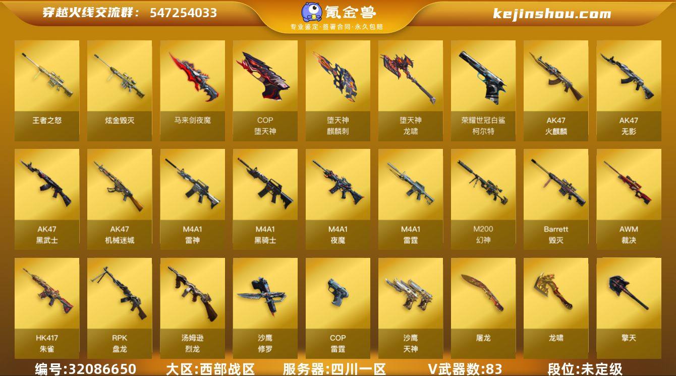 四川一区-88V-4王者武器数-1炫金武器数 【热门武器】:HK417-朱雀,M200-幻神*2,死亡之眼,荣耀世冠-火麒麟,荣耀世冠-柯尔特,M4A1-黑骑士,汤姆逊-烈龙*6,RPK-盘龙*4,加特林-炼狱*3,羊驼玩偶,降世魔童,COP-堕天神*3,沙鹰-修罗 【王者炫金武器】:王者之怒,炫金毁灭 【音效卡】:AK47-火麒麟音效卡,M4A1-雷神音效卡,M4A1-黑骑士音效卡,Barrett-毁灭音效卡 【皮肤】:幻神-冠军之幻,雷神-星空,火麒麟-心动糖果,毁灭-星空,毁灭-冠军之怒,无影耀金皮肤,AK47-黑武士-361,战神-流金岁月皮肤 【角色】:零,炫,初恋灵狐,风暴女,嘉年华灵狐,灵狐者-黄金海岸,麻雀,蛇姬,铁骑荣耀,新娜塔莎 【人偶武器】:M4A1-雷神-精英刀锋,海滩汪汪-巴雷特,迷你深渊冰龙*2,降世魔童 【暴走生化】:死亡之眼,超级对讲机 【挑战大师】:AK47-冰龙粉碎者,VEPR-12-金魔,激光毁灭者III*2,阐释者III 【英雄级武器】:AK47-火麒麟,M4A1-雷神,M4A1-黑骑士,AK47-无影,AK47-黑武士,AK47-机械迷城,M4A1-雷霆,HK417-朱雀,M4A1-夜魔*2,王者之武-觉醒版,王者之势-觉醒版,王者之幻-觉醒版,荣耀世冠-火麒麟,Barrett-毁灭,AWM-裁决,M200-幻神*2,RPK-盘龙*4,加特林-炼狱*3,汤姆逊-烈龙*6,沙鹰-修罗,沙鹰-天神,COP-雷霆,COP-堕天神*3,柯尔特-电竞装甲,荣耀世冠-柯尔特,破空枪刃-夜魔,屠龙,龙啸,麒麟刺-堕天神,马来剑-夜魔,擎天*2,龙啸-堕天神,高爆手雷-雷霆*5,高爆手雷-堕天神*2,高爆手雷-夜魔*5,闪光弹-雷霆*4,闪光弹-堕天神*2,闪光弹-夜魔*5,烟雾弹-雷霆*4,烟雾弹-堕天神*2,烟雾弹-夜魔*5,M4A1-赤狱骑士 【道具】:古蛇迷踪炫彩背包,炫彩背包,超级背包,救世主-黑桃战神,生化弹匣,夺命之镰,防化服,金色流光-枪王排位*2,星辰流光-枪王排位,枪王排位28赛季金色流光,枪...