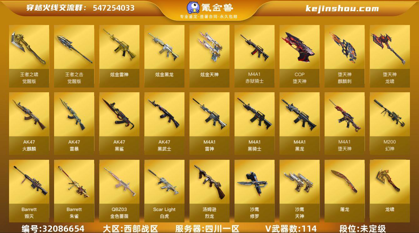 陕西一区-128V-5王者武器数-3炫金武器数 【热门武器】:QBZ03-金色蔷薇,Scar Light-白虎,M200-幻神,M200-竞技荣光,M4A1-黑骑士,汤姆逊-烈龙*6,加特林-炼狱,斯泰尔-蝴蝶,USP-雷暴*2,COP-堕天神*3,沙鹰-修罗*3,金刚伞 【王者炫金武器】:炫金黑龙,炫金雷神,炫金天神 【音效卡】:M200-幻神音效卡,AK47-火麒麟音效卡,M4A1-雷神音效卡,M4A1-黑骑士音效卡,Barrett-毁灭音效卡,炼狱-百战金芒-庆典舞曲音效卡,柯尔特-百战金芒-庆典舞曲音效卡 【皮肤】:幻神-AG-CFPLS17冠军,雷神-暗月,M4A1-战神赵云,M4A1-再燃火线,火麒麟-战神关羽,毁灭耀金皮肤*2,毁灭-英雄计划 皮肤,AK47-B-常胜将军-刘备*2,AK47-B-常胜将军-孙权,轻型军用手斧-再燃火线 【角色】:葵,樱,魅影,炫,春,电竞教官-云悠悠,王者-瞳-闭月羞花,王者-葵-貂蝉,暗夜-X,风暴女,灵狐者-职业经理,青霞仙子,职业选手 【人偶武器】:斯泰尔-蝴蝶,巴雷特-零-水下丽影,迷你深渊冰龙,迷你牛牛,闪光弹-貂蝉,高爆手雷-大乔 【暴走生化】:超级对讲机 【挑战大师】:火狱乱世-超越Max,激光毁灭者III-白马银枪,激光毁灭者III,机甲撕裂者III,神圣爆裂者-末日III 【英雄级武器】:AK47-火麒麟,M4A1-黑龙,M4A1-雷神,M4A1-黑骑士,AK47-黑武士,AK47-黑鲨*3,AK47-雷暴,M4A1-堕天神*2,Scar Light-白虎,FAMAS G2-天戎,QBZ03-金色蔷薇,王者之戮-觉醒版,AK-47-猩红传说,AK47-B-常胜将军,Barrett-毁灭*2,M200-幻神,Barrett-朱雀,M200-竞技荣光,加特林-炼狱,炼狱-百战金芒,汤姆逊-烈龙*6,沙鹰-修罗*3,沙鹰-天神,USP-雷暴*2,COP-堕天神*3,柯尔特-竞技荣光,屠龙*4,龙啸,麒麟刺-堕天神*3,擎天,麒麟刺,幻灵之锋*2,擎天-竞技荣光,龙啸-堕天神,斩神刀-雷暴,麒