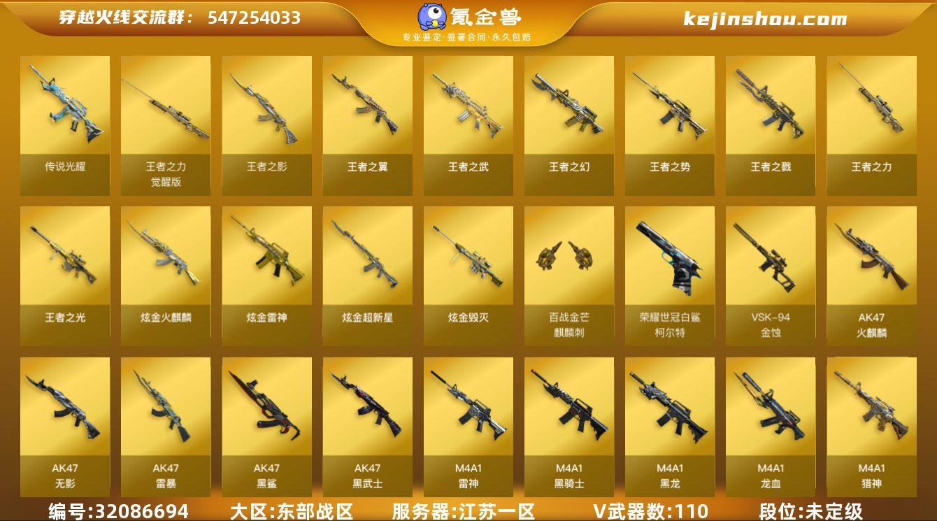 江苏一区-121V-16王者武器数-6炫金武器数 【传说武器】:传说光耀 【热门武器】:传说光耀,QBZ03-金色蔷薇,Scar Light-白虎,HK417-朱雀,M200-幻神,死亡之眼,荣耀世冠-雷神,荣耀世冠-柯尔特,Kar98K-星神,M4A1-黑骑士*3,汤姆逊-烈龙*6,RPK-盘龙*7,加特林-炼狱*6,斯泰尔-蝴蝶,USP-雷暴*2,沙鹰-修罗*4 【王者炫金武器】:王者之戮,王者之幻,王者之翼,王者之势,王者之武,王者之影,王者之光,王者之力,王者冰锋,炫金火麒麟,炫金骑士,炫金雷神,炫金武士,炫金超新星,炫金毁灭 【音效卡】:AK47-火麒麟音效卡,M4A1-雷神音效卡,M4A1-黑龙音效卡,M4A1-黑骑士音效卡,Barrett-毁灭音效卡,AWM-裁决音效卡,QBZ03-天罚音效卡,Barrett-碧霄极光音效卡,炼狱-百战金芒-庆典舞曲音效卡 【皮肤】:裁决-运输船 皮肤,雷神-星空,M4A1-雷神-CFS 2019,火麒麟-冠军之心,火麒麟-平天大圣,毁灭耀金皮肤,毁灭-星空,黑龙-能量核心,M4A1-黑龙-361,黑骑士耀金皮肤,无影耀金皮肤,战神-紫绶金章皮肤,战神-流金岁月皮肤,AWM-天龙-传奇白鲨,极光-能量核心,炼狱-星空,修罗-能量核心,屠龙-荣耀之锋,屠龙-荣耀世冠AG,轻型军用手斧-再燃火线 【角色】:葵,魅影,春,机械姬,零·纪元,王者-瞳-闭月羞花,王者-零,王者之瞳,王者玲珑,王者-魅影,葵-阿尔法武装,空,暗夜-X,北极狐-X,初恋灵狐,风暴女,娟娟,兰-海滩派对,兰妹妹,零-水下丽影,灵狐者-黄金海岸,龙儿-小淘气,潘多拉-X,潜龙队-X,斯沃特-X,蜀雪,铁骑荣耀,兔囡囡,新灵狐者,新娜塔莎 【人偶武器】:天龙-曼陀罗,M4A1-雷神-精英刀锋,斯泰尔-蝴蝶,COP-旗袍,迷你深渊冰龙*2,迷你裂空之翼,夺魂*2,迷你牛牛*2,迷你生化手雷,生化手雷-机甲核心,深渊终结者手雷,闪光弹-小乔,迷你艾比 【暴走生化】:死亡之眼,超级...