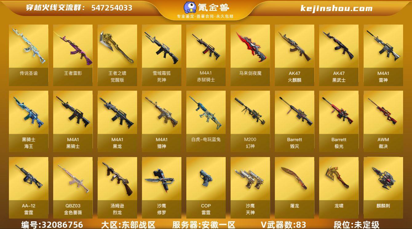 安徽一区-90V-9王者-0炫金 【传说武器】:传说圣谕 【传说角色】:传说星骇 【热门武器】:传说圣谕,QBZ03-金色蔷薇,M200-幻神,死亡之眼,白虎-电玩蓝兔,柯尔特-冠军之特,毒蜂,M4A1-黑骑士,汤姆逊-烈龙*6,加特林-炼狱,COP-白鲨,沙鹰-修罗*2 【王者炫金武器】:王者雷影,王者之魄高爆手雷,王者之魄闪光弹*2 【音效卡】:AWM-裁决音效卡,QBZ03-天罚音效卡,Barrett-碧霄极光音效卡,炼狱-百战金芒-庆典舞曲音效卡,死神-雪域霜狐-怀旧音效卡,AK47-火麒麟-怀旧音效卡 【皮肤】:幻神-丹凤,幻神-电流骇客 皮肤,幻神-荣耀世冠EP 皮肤,QBZ03-冠军之薇,裁决-运输船 皮肤,星神-璀璨皮肤,雷神-暗月,雷神-源计划2.0专属 皮肤,M4A1-再燃火线,火麒麟-平天大圣,火麒麟-心动糖果,毁灭-冠军之怒,黑骑士-暗月,天罚-课桌奇兵 皮肤,战神-粉色甜心皮肤*2,战神-紫绶金章皮肤,战神-流金岁月皮肤,AK47-B-常胜将军-刘备*3,极光-高能霹雳 皮肤,炼狱-玩具枪皮肤,修罗-百战金芒 皮肤,屠龙-荣耀世冠AG,屠龙-星火燎原,屠龙-春桃 皮肤,屠龙-惊鸿 皮肤,轻型军用手斧-再燃火线 【角色】:魅影,雨棠,机械姬,隐,妮妮,王者-瞳-闭月羞花,王者-魅影,王者玲珑-小乔,王者潘多拉,雪域霜狐,乔伊教练,云海玲珑,炽天使,暗夜-X,初恋灵狐,风暴女,疾风,娟娟,卡塔琳娜,兰妹妹,零-水下丽影,灵狐-花神,灵狐者-黄金海岸,龙儿,龙儿-小淘气,麻雀,曼陀罗-X,玫瑰花神,潘多拉-甜心教官,潜龙队-X,青霞仙子,蛇姬,斯沃特-X,铁骑荣耀,雪莉杨,影武者-X,智影 【人偶武器】:COP-白鲨,火麒麟-灵狐,迷你救赎猎手,异变清道夫-蛇影双骄,AWM-灵狐-15周年嘉年华,M37-葵,迷你深渊冰龙,夺魂,迷你牛牛,迷你生化手雷*2,生化手雷-机甲核心*3,深渊终结者手雷*2,闪光弹-小乔,闪光弹-貂蝉,高爆手雷...