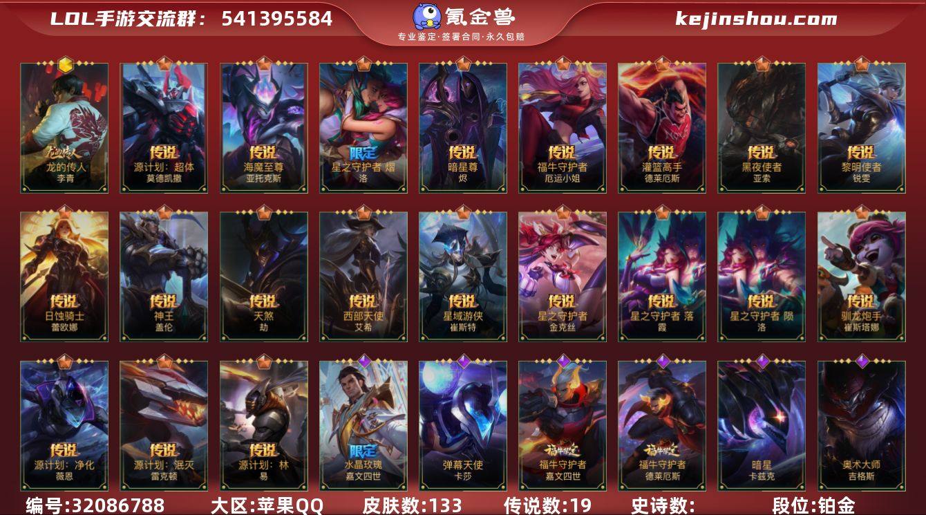 MLL1455【2神话 传说19 】苹果Q-英雄133-皮肤133-段位:铂金【神话】夜星流火金克丝 龙的传人李青【传说】日蚀骑士蕾欧娜 福牛守护者女枪 灌篮高手德莱厄斯 黑夜使者亚索 黎明使者锐雯 神王盖伦 天煞劫 西部天使艾希 星域游侠崔斯特 星之守护者金克丝 暗星尊 驯龙炮手崔丝塔娜 源计划林易 源计划泯灭雷克顿 星之守护者陨落 星之守护者落霞 源计划净化薇恩 海魔至尊亚托克斯 源计划超体莫德凯撒【皮肤】 腥红之月烬 星之守护者风女 暮星之羽 破败军团德莱文 弹幕天使 水晶玫瑰皇子 真实伤害赛娜 怨之砂 摄魂猎手凯隐 绝命机甲男枪 驯龙女巫 银河魔装机神龙女 泳池派对剑姬 源计划:裁决 源代码青钢影 玉剑传说 无双 斗魂无双尼菈 星之守护者琴女 小蜜蜂提莫 神奇先驱杰斯 腥红之月剑魔 福牛守护者皇子 雷喵喵尔 灰烬领主 柯基 福牛守护者剑姬 猎龙勇士奥拉夫 钢铁军团 福牛守护者牛头 福牛守护者诺手 暗星螳螂 奥术大师吉格斯 白色死神维鲁斯 苍穹之光火男 福牛守护者安妮 地狱火阿木木 铁血女忍 s1光耀之刃 s3光耀之灵 s4光耀之心 s5绯金魅影 s6绯金丽刃 s7绯金战斧 s8绯金鮫灵 s9王牌舰长