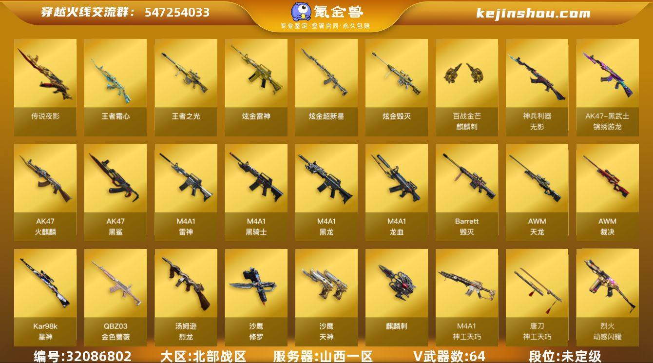 山西一区-71V-5王者武器数-5炫金武器数 【传说武器】:传说夜影 【传说角色】:传说艾莉莎 【热门武器】:传说夜影,QBZ03-金色蔷薇,死亡之眼,Kar98K-星神,炼狱-迷你小钢,M4A1-黑骑士,汤姆逊-烈龙*7,加特林-炼狱*2,火麒麟-绝迹,COP-白鲨,沙鹰-修罗*4 【王者炫金武器】:王者霜心,王者之光,炫金骑士,炫金雷神,炫金武士,炫金超新星,炫金毁灭 【音效卡】:AK47-火麒麟音效卡,M4A1-雷神音效卡,M4A1-黑骑士音效卡,Barrett-毁灭音效卡,火线妹语音包,传情小小语音包 【皮肤】:白虎-大汉风骨,星神-漫游,雷神-星空,雷神-冠军之魄,毁灭-直播专属,黑骑士-冠军之势,麒麟刺-萌杀皮肤 【角色】:兰-巾帼英雄,晴雅,王者-零,乔伊教练,飞虎队-X,风暴女,嘉年华灵狐,兰-海滩派对,灵狐者-X,女主播,潘多拉-X,潘多拉-甜心教官,兔囡囡,新灵狐者,影武者-X,游珑儿 【人偶武器】:火麒麟-绝迹,COP-白鲨,炼狱-迷你小钢,AWM-灵狐-15周年嘉年华*3,生化手雷-机甲核心*2,灵狐娃娃手雷 【暴走生化】:死亡之眼,超级对讲机 【挑战大师】:冰龙粉碎者-白马银枪,神圣爆裂者-末日III,阐释者III 【英雄级武器】:AK47-火麒麟,M4A1-黑龙,M4A1-雷神,M4A1-黑骑士,AK47-黑鲨,M4A1-龙血,QBZ03-天罚,M4A1-神工天巧,无影-神兵利器,黑武士-锦绣游龙,QBZ03-金色蔷薇,烈火-动感闪耀,王者之魄-觉醒版,王者之势-觉醒版,白虎之魄-觉醒版,AWM-天龙*2,Barrett-毁灭*2,AWM-裁决,Kar98K-星神,加特林-炼狱*2,汤姆逊-烈龙*7,沙鹰-修罗*4,沙鹰-天神,USP-神工天巧,天神-动感闪耀,麒麟刺,唐刀-神工天巧,屠龙-动感闪耀,高爆手雷-神工天巧*7,手雷-动感闪耀,闪光弹-神工天巧*9,烟雾弹-神工天巧*7 【道具】:亚洲杯纪念炫彩背包,炫彩背包,超级背包,黄金魔花研究所背包,救世主-黑桃战神,绿...
