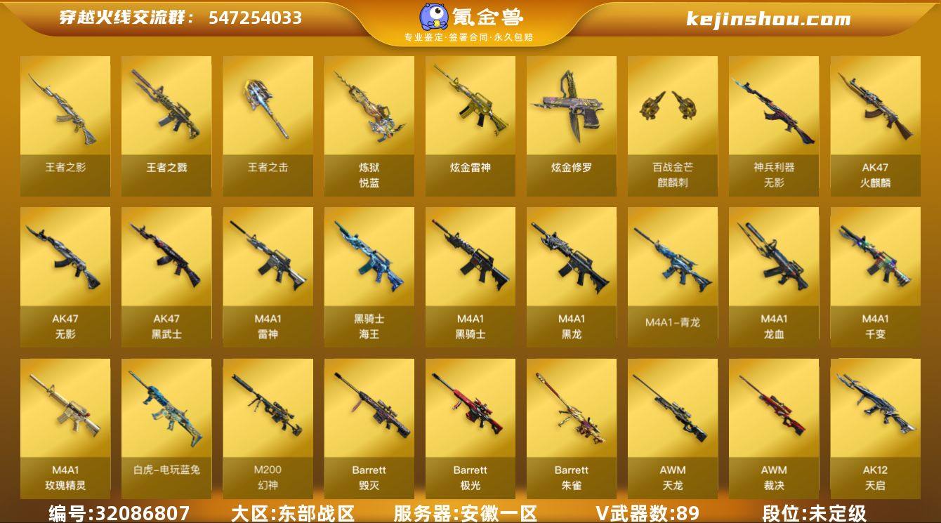 安徽一区-98V-9王者武器数-6炫金武器数 【热门武器】:QBZ03-金色蔷薇,M14EBR-玄武,Scar Light-白虎,HK417-朱雀,M4A1-青龙,M200-幻神,死亡之眼*3,白虎-电玩蓝兔,柯尔特-冠军之特,M4A1-黑骑士,汤姆逊-烈龙*6,RPK-盘龙*5,加特林-炼狱,斯泰尔-蝴蝶,沙鹰-修罗*5,Knife-冠军之刃,黄金猫猫手套-白鲨 【王者炫金武器】:王者之戮,王者之影,炼狱-悦蓝,王者之击,炫金骑士,炫金雷神,炫金修罗*4 【音效卡】:M200-幻神音效卡,AK47-火麒麟音效卡*2,M4A1-雷神音效卡,M4A1-黑骑士音效卡*2,Barrett-毁灭音效卡,QBZ03-金色蔷薇音效卡,炼狱-百战金芒-庆典舞曲音效卡 【皮肤】:幻神-动感闪耀 皮肤,QBZ03-冠军之薇,雷神-荣耀之魄,雷神-虎将,雷神-宇航兔皮肤,M4A1-再燃火线,火麒麟-AG战队皮肤,火麒麟-轻羽皮肤,火麒麟-平天大圣,火麒麟-心动糖果,毁灭-荣耀之怒,毁灭耀金皮肤,毁灭-黑大圣皮肤,M4A1-千变-孔明皮肤*2,黑龙-冠军之武,黑骑士耀金皮肤,黑骑士-冠军之势,黑骑士-AG-S4冠军典藏,战神-流金岁月皮肤,AK47-B-常胜将军-孙权,炼狱-玩具枪皮肤,轻型军用手斧-再燃火线 【角色】:魅影,雨棠,鹰,王者-瞳-闭月羞花,王者涂鸦,乔伊教练,修道士,云海玲珑,炽天使,暗夜-X,北极狐-X,芳心审判者,嘉年华灵狐,娟娟,灵狐者-X,灵狐者-七夕宝贝,麻雀,曼陀罗-礼服,潘多拉-X,邱刚敖,斯沃特-X,蜀雪,兔囡囡,夜玫瑰-幻能朋克,樱-战斗天使,职业选手 【人偶武器】:M4A1-雷神-精英刀锋,斯泰尔-蝴蝶,AWM-灵狐-15周年嘉年华,迷你深渊冰龙,迷你生化手雷,生化手雷-机甲核心,迷你超能女侍 【暴走生化】:死亡之眼*3 【挑战大师】:冰龙粉碎者-白马银枪,激光毁灭者III-白马银枪,激光毁灭者III,神圣爆裂者-末日III*2 【英雄级武器】:M4A1-千变*6,AK47-火麒麟*3,M4A1-黑龙,M...