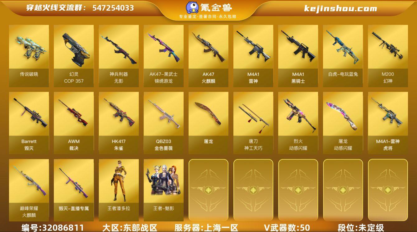 上海一区-51V-6王者武器数-0炫金武器数 【传说武器】:传说破晓 【热门武器】:传说破晓,QBZ03-金色蔷薇,HK417-朱雀,M200-幻神,白虎-电玩蓝兔*2,柯尔特-冠军之特*2,M4A1-黑骑士,COP 357-幻灵 【音效卡】:沙鹰-修罗-盛典舞曲音效卡*2,麒麟刺-百战金芒-盛典舞曲音效卡,炼狱-百战金芒-庆典舞曲音效卡 【皮肤】:幻神-宠儿-2021MVP,幻神-纸灯龙皮肤,幻神-电流骇客 皮肤,QBZ03-AG-CFPLS19冠军,QBZ03-巅峰荣耀皮肤,裁决-巅峰荣耀 皮肤,雷神-荣耀之魄,雷神-虎将,雷神-源计划2.0专属 皮肤,M4A1-再燃火线,火麒麟-百城,火麒麟-巅峰荣耀,火麒麟-心动糖果,毁灭-直播专属,毁灭-英雄计划 皮肤,轻型军用手斧-再燃火线,麒麟刺-甜蜜糖果 皮肤 【角色】:王者-魅影,王者潘多拉,奇洋探员,乔伊教练,葵-阿尔法武装,暗夜-X,飞虎队-X,风暴女,虎妞,嘉年华灵狐,灵狐者-X,麻雀,女主播,潘多拉-X,斯沃特-X,雪莉杨-摸金校尉,幽,游珑儿 【人偶武器】:AWM-灵狐-15周年嘉年华,生化手雷-机甲核心 【暴走生化】:超级对讲机 【挑战大师】:神圣爆裂者-末日III 【英雄级武器】:AK47-火麒麟,M4A1-雷神*2,M4A1-黑骑士,HK417-朱雀,无影-神兵利器,黑武士-锦绣游龙,QBZ03-金色蔷薇,烈火-动感闪耀,王者之势-觉醒版,白虎-电玩蓝兔*2,Barrett-毁灭,AWM-裁决,M200-幻神,炼狱-百战金芒,COP 357-幻灵,柯尔特-冠军之特*2,天神-动感闪耀,屠龙,唐刀-神工天巧,屠龙-动感闪耀,龙啸-热带奇洋,麒麟刺-百战金芒,丛林匕首-玄豹*2,高爆手雷-幻灵,高爆手雷-神工天巧,手雷-动感闪耀,高爆手雷-云龙*2,手雷-热带奇洋,高爆手雷-玄豹,高爆手雷-雷霆王者-觉醒版,闪光弹-幻灵,闪光弹-神工天巧,闪光弹-云龙*2,闪光弹-玄豹,闪光弹-雷霆王者-觉醒版*2,烟雾弹-神工天巧*2,烟雾弹-云龙*4,烟雾弹-玄...
