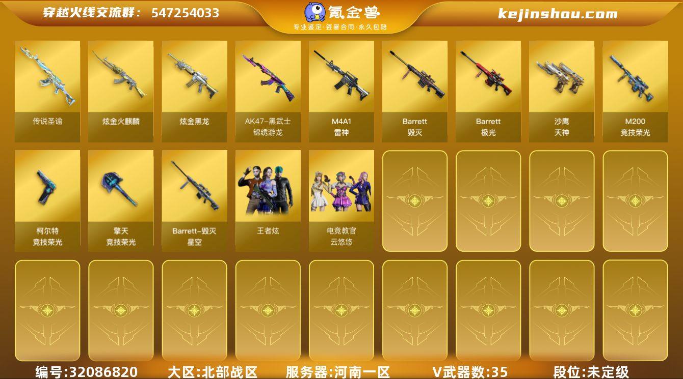 河南一区-43V-1王者武器数-2炫金武器数 【传说武器】:传说圣谕 【热门武器】:传说圣谕,M200-竞技荣光 【王者炫金武器】:炫金火麒麟,炫金黑龙 【音效卡】:Barrett-毁灭音效卡 【皮肤】:毁灭-星空,毁灭-百城浙江 皮肤,毁灭-英雄计划 皮肤,Barrett-金色蔷薇-蛇姬 皮肤 【角色】:电竞教官-云悠悠,王者炫,奇洋探员,云海玲珑,北极狐-X,风暴女,娟娟,灵狐者-X,麻雀,潘多拉-甜心教官,兔囡囡,雪莉杨-摸金校尉,影武者-X,智影 【暴走生化】:超级对讲机 【挑战大师】:AK47-冰龙粉碎者 【英雄级武器】:M4A1-雷神,黑武士-锦绣游龙,王者之势-觉醒版,Barrett-毁灭,Barrett-极光,M200-竞技荣光,Barrett-金色蔷薇,沙鹰-天神,柯尔特-竞技荣光*2,擎天-竞技荣光*2,高爆手雷-竞技荣光*3,闪光弹-竞技荣光*5,烟雾弹-竞技荣光*5,M4A1-赤狱骑士 【道具】:CFS限定背包,云山科技背包,亚洲杯纪念炫彩背包,救世主-黑桃战神,绿色巨人,灵魂忍者,迷雾幽灵,夺命之镰,防化服*3,金色流光-枪王排位*2,枪王排位28赛季金色流光,枪王排位29赛季金色流光,电玩兔兔表情,云海游龙表情,C4-沙漠,防弹头盔*7,防弹衣*6,C4工具钳*6,手雷包*6 【特殊枪械】: