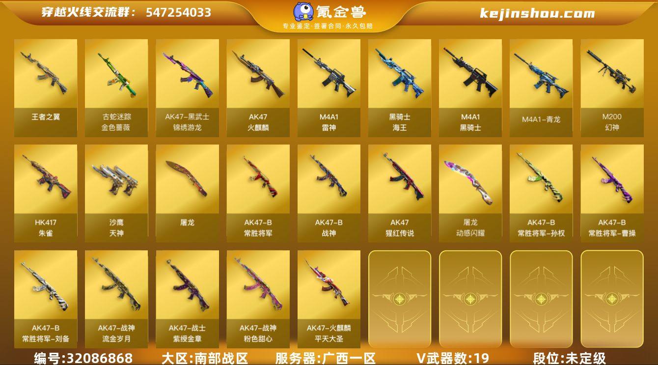 广西一区-20V-5王者-0炫金 【热门武器】:HK417-朱雀,M4A1-青龙,M200-幻神,金色蔷薇-古蛇迷踪,修罗-古蛇迷踪,M4A1-黑骑士,加特林-炼狱 【王者炫金武器】:王者之翼 【音效卡】:M200-幻神音效卡,M4A1-黑骑士音效卡 【皮肤】:幻神-荣耀世冠EP 皮肤,火麒麟-平天大圣,战神-粉色甜心皮肤,战神-紫绶金章皮肤,战神-流金岁月皮肤,AK47-B-常胜将军-曹操,AK47-B-常胜将军-刘备,AK47-B-常胜将军-孙权,修罗-星空 【角色】:战地猎狐,蛇隐宗,娟娟,兰-新年限定,玫瑰花神,潘多拉-甜心教官,潜龙队-X,青霞仙子,蛇姬,蜀雪,铁骑荣耀,雪莉杨,雪莉杨-摸金校尉,智影 【人偶武器】:迷你钢铁终结者,迷你深渊冰龙,迷你牛魔王,闪光弹-小乔,闪光弹-貂蝉,高爆手雷-大乔 【挑战大师】:AK47-冰龙粉碎者 【英雄级武器】:AK47-火麒麟,M4A1-雷神,M4A1-黑骑士,M4A1-青龙,HK417-朱雀,黑武士-锦绣游龙,金色蔷薇-古蛇迷踪,AK-47-猩红传说,AK47-B-战神,黑骑士-海王*2,AK47-B-常胜将军,M200-幻神,加特林-炼狱,沙鹰-天神,修罗-古蛇迷踪,屠龙,王者之啸-觉醒版,王者之击-觉醒版*2,高爆手雷-古蛇迷踪,烟雾弹-古蛇迷踪,烟雾弹-荣耀世冠EP 【道具】:EP战队炫彩背包,古蛇迷踪炫彩背包,炫彩背包,超级背包,女皇终结者-魔龙之吻,救世主-黑桃战神,黄金生化钩,绿色巨人,灵魂忍者,迷雾幽灵,生化弹匣,夺命之镰,防化服*2,枪王排位29赛季金色流光,古蛇迷踪打击特效,蛇隐宗表情,防弹头盔*4,防弹衣*5,C4工具钳*5,手雷包*4 【特殊枪械】:1黑骑士,1炼狱