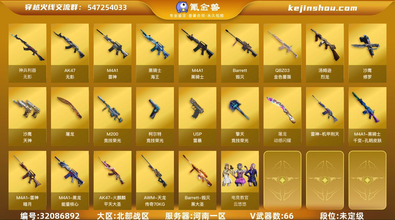 河南一区-69V-2王者-0炫金 【热门武器】:QBZ03-金色蔷薇,M200-竞技荣光,死亡之眼,M4A1-黑骑士,汤姆逊-烈龙*6,USP-雷暴,沙鹰-修罗*2 【音效卡】:M4A1-黑骑士音效卡,Barrett-毁灭音效卡,Barrett-碧霄极光音效卡,麒麟刺-百战金芒-盛典舞曲音效卡,炼狱-百战金芒-庆典舞曲音效卡,柯尔特-百战金芒-庆典舞曲音效卡 【皮肤】:雷神-暗月,雷神-烈虎皮肤,雷神-机甲刑天皮肤,M4A1-再燃火线,雷神-神秘按键 皮肤,火麒麟-平天大圣,毁灭-黑大圣皮肤,毁灭-英雄计划 皮肤,M4A1-千变-孔明皮肤*2,黑龙-能量核心,AWM-天龙-传奇70KG,屠龙-春桃 皮肤,轻型军用手斧-再燃火线 【角色】:电竞教官-云悠悠,暗夜-X,初恋灵狐,风暴女,虎妞,嘉年华灵狐,娟娟,灵狐者-七夕宝贝,龙儿-小淘气,潘多拉-甜心教官,青霞仙子,铁骑荣耀,雪莉杨-摸金校尉,樱-战斗天使 【人偶武器】:AWM-灵狐-15周年嘉年华*2,迷你深渊冰龙,夺魂,迷你生化手雷,深渊终结者手雷*2 【暴走生化】:死亡之眼,超级对讲机 【挑战大师】:激光毁灭者III-白马银枪,激光毁灭者III,神圣爆裂者-末日III*2 【英雄级武器】:M4A1-雷神,M4A1-黑骑士,AK47-无影,无影-神兵利器,QBZ03-金色蔷薇,王者之魄-觉醒版,王者冰魄-觉醒版,黑骑士-海王,Barrett-毁灭,M200-竞技荣光,炼狱-百战金芒,汤姆逊-烈龙*6,沙鹰-修罗*2,沙鹰-天神*3,USP-雷暴,柯尔特-竞技荣光,柯尔特-百战金芒,屠龙,擎天-竞技荣光*2,麒麟刺-百战金芒,高爆手雷-幻灵,高爆手雷-竞技荣光*7,闪光弹-幻灵,闪光弹-竞技荣光*9,烟雾弹-幻灵,烟雾弹-竞技荣光*12,M4A1-苍鸣雷神,Barrett-碧霄极光 【道具】:冰冰企鹅背包,女皇终结者-背包,炫彩背包,百战金芒炫彩背包,虎牙炫彩背包,超级背包,圣拳猎手-炽雪,女皇终结者-魔龙之吻,绿色巨人,灵魂忍者,变异宝贝,妖...