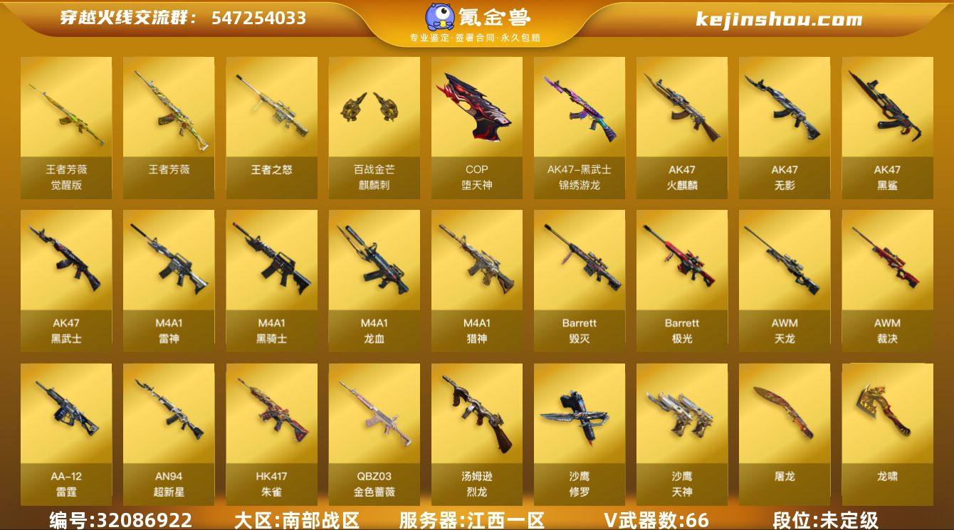 江西一区-70V-9王者-0炫金 【热门武器】:QBZ03-金色蔷薇*2,HK417-朱雀,M200-竞技荣光,死亡之眼,M4A1-黑骑士,汤姆逊-烈龙*2,加特林-炼狱,羊驼玩偶,COP-堕天神,沙鹰-修罗*4,金刚伞 【王者炫金武器】:王者芳薇,王者之怒 【音效卡】:M4A1-雷神音效卡,M4A1-黑骑士音效卡,Barrett-毁灭音效卡 【皮肤】:裁决-流光秘银,雷神-能量核心,雷神-耀金皮肤,火麒麟-平天大圣,毁灭-暗月,毁灭-航天科技皮肤,M4A1-千变-孔明皮肤,黑骑士耀金皮肤,无影耀金皮肤,战神-粉色甜心皮肤,战神-紫绶金章皮肤,战神-流金岁月皮肤,AK47-B-常胜将军-刘备*2,AK47-B-常胜将军-孙权 【角色】:葵,瞳,魅影,电竞教官-云悠悠,乔伊教练,云海玲珑,王者-瞳-闭月羞花,王者-葵-貂蝉,王者葵-惊若翩鸿,王者潘多拉,幽,蜀雪 【人偶武器】:AWM-灵狐-15周年嘉年华,迷你牛牛,迷你生化手雷*2,生化手雷-机甲核心,深渊终结者手雷,闪光弹-小乔,闪光弹-貂蝉,高爆手雷-大乔 【暴走生化】:死亡之眼 【挑战大师】:冰龙粉碎者-白马银枪,激光毁灭者III-白马银枪,阐释者III 【英雄级武器】:AK47-火麒麟,M4A1-雷神,M4A1-黑骑士,AK47-无影*2,AK47-黑武士,AN94-超新星,AK47-黑鲨,M4A1-龙血,HK417-朱雀,黑武士-锦绣游龙,QBZ03-金色蔷薇*2,M4A1-猎神,烈火-动感闪耀,AK-47-猩红传说,AK47-B-战神,AK47-B-常胜将军,AWM-天龙*2,Barrett-毁灭*2,Barrett-极光,AWM-裁决,M200-竞技荣光,Barrett-金色蔷薇,王者之光-觉醒版,加特林-炼狱,汤姆逊-烈龙*2,AA-12-雷霆,沙鹰-修罗*4,沙鹰-天神,COP-堕天神,柯尔特-竞技荣光,天神-动感闪耀,屠龙*2,龙啸,麒麟刺*2,擎天-竞技荣光,屠龙-动感闪耀,王者之啸-觉醒版,王者之击-觉醒版,高爆手雷-竞技荣光*4,手雷-动感闪耀,闪光弹-竞技荣光*7,闪光弹-神工天巧,...