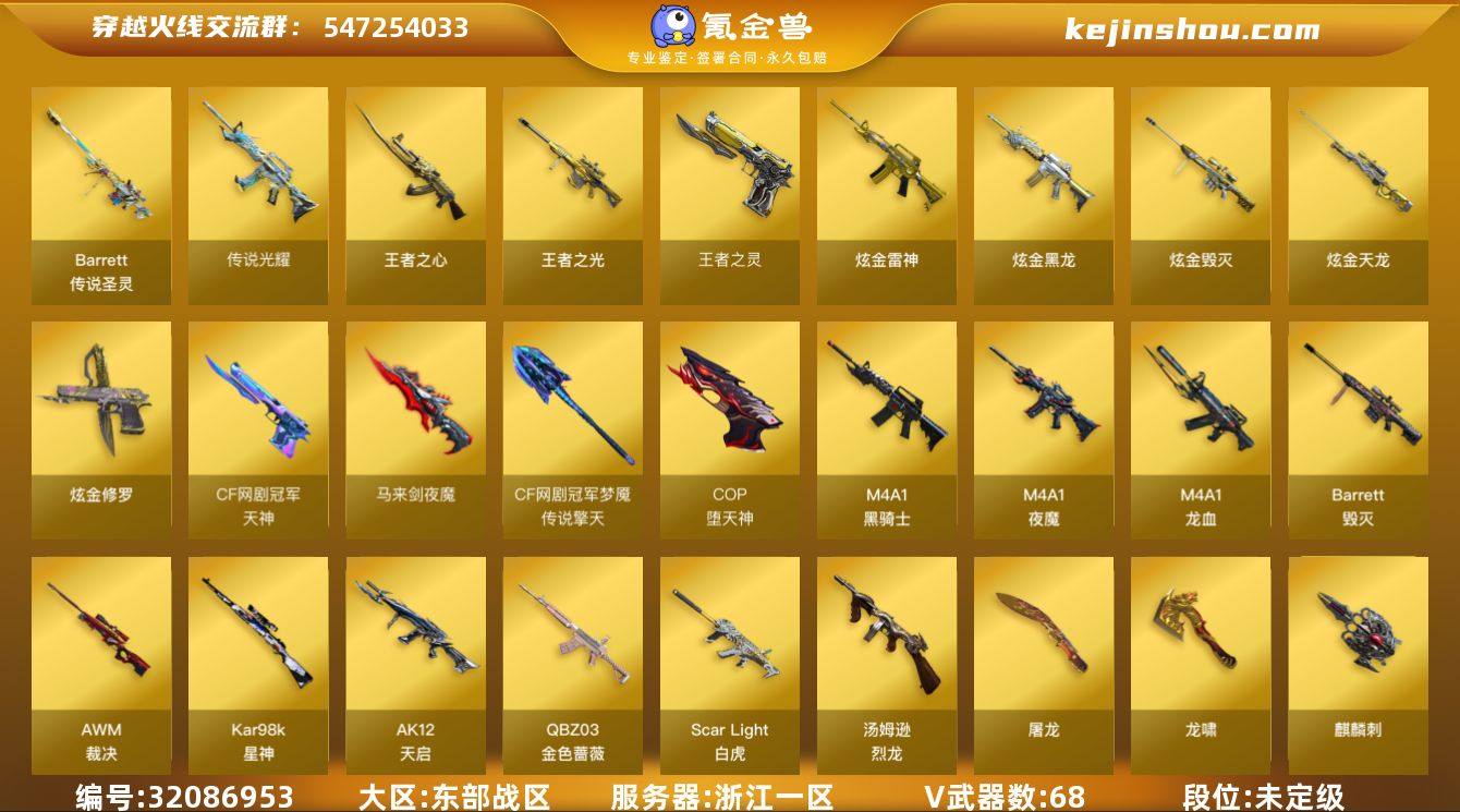 浙江一区-75V-9王者武器数-7炫金武器数 【传说武器】:传说光耀,传说圣灵 【热门武器】:传说光耀,传说圣灵,QBZ03-金色蔷薇*2,Scar Light-白虎,死亡之眼,Kar98K-星神,C.A.T,M4A1-黑骑士*5,汤姆逊-烈龙*6,斯泰尔-蝴蝶,COP-堕天神,柯尔特-赛博朋克*2,金刚伞 【王者炫金武器】:王者之心,王者之光,王者之灵*2,炫金黑龙,炫金雷神,炫金毁灭,炫金天龙*2,炫金修罗*2 【皮肤】:雷神-虎将,雷神-耀金皮肤,火麒麟-华夏之心,毁灭-星空,无影耀金皮肤,无影-霓裳皮肤 【角色】:葵,魅影,王者玲珑,王者-救世主,王者玲珑-小乔,疾风,娟娟,零-水下丽影,灵狐者-X,灵狐者-职业经理,青霞仙子,五号兵器-赛博朋克,夜玫瑰-幻能朋克,樱-战斗天使 【人偶武器】:斯泰尔-蝴蝶,巴雷特-零-水下丽影,C.A.T,迷你深渊冰龙,夺魂,迷你生化手雷*3,深渊终结者手雷,QBZ03-斯沃特 【暴走生化】:死亡之眼 【挑战大师】:致命乱世-超越Max,神圣爆裂者III,VEPR-12-金魔,神圣爆裂者-末日III 【英雄级武器】:M4A1-黑骑士*5,AK12-天启,M4A1-龙血*3,Scar Light-白虎,M4A1-夜魔,QBZ03-金色蔷薇*2,王者之魄-觉醒版,王者之势-觉醒版,黑武士-CF网剧冠军,Barrett-毁灭*5,AWM-裁决,Kar98K-星神,王者之决-觉醒版,王者幻神-觉醒版,汤姆逊-烈龙*6,COP-堕天神,破空枪刃-夜魔*2,天神-CF网剧冠军,屠龙,龙啸*3,马来剑-夜魔,麒麟刺,斩神刀-雷暴,擎天-CF网剧冠军,王者之锋-觉醒版,高爆手雷-雷暴*3,高爆手雷-夜魔*6,闪光弹-雷暴*3,闪光弹-夜魔*6,烟雾弹-雷暴*3,烟雾弹-夜魔*6 【道具】:背包-洛丽塔,超级背包,救世主-黑桃战神,绿色巨人,灵魂忍者*2,变异宝贝,迷雾幽灵,夺命之镰,防化服*2,星辰流光-枪王排位,防弹头盔*2,防弹衣*2,C4工具钳*2,手雷包*2 【特殊枪械】:蝴蝶斯泰尔+6烈...