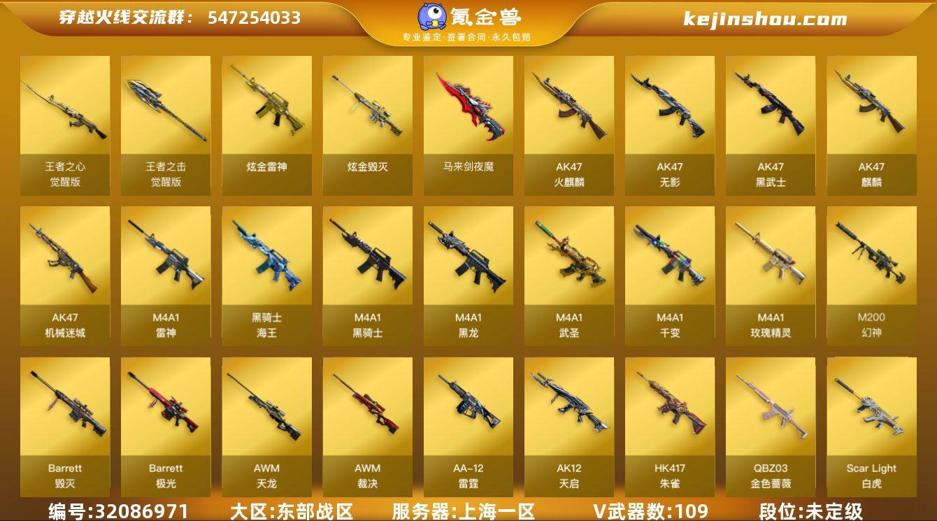 上海一区-118V-6王者武器数-5炫金武器数 【热门武器】:QBZ03-金色蔷薇,Scar Light-白虎,HK417-朱雀,M200-幻神,M200-竞技荣光,死亡之眼,荣耀世冠-火麒麟,M4A1-黑骑士,汤姆逊-烈龙*2,羊驼玩偶,裁决-雪莉杨,USP-雷暴,沙鹰-修罗*3 【王者炫金武器】:炫金骑士*2,炫金雷神,炫金毁灭*2 【音效卡】:AK47-火麒麟音效卡,M4A1-雷神音效卡,M4A1-黑龙音效卡*2,M4A1-黑骑士音效卡,Barrett-毁灭音效卡,Barrett-碧霄极光音效卡,炼狱-百战金芒-庆典舞曲音效卡 【皮肤】:幻神-AG-CFPLS17冠军,幻神-电竞之星 皮肤,白虎-大汉风骨,AWM-裁决-百城联赛天津皮肤,裁决-叶芒苍灵 皮肤,裁决-运输船 皮肤,雷神-暗月,雷神-星空,雷神-虎将,雷神-传奇N9,雷神-R.LGD-CFPLS18冠军,雷神-诺拉 皮肤,M4A1-再燃火线,雷神-神秘按键 皮肤,火麒麟-心动糖果,毁灭-暗月,毁灭耀金皮肤*2,毁灭-星空,毁灭-虹光风暴 皮肤,毁灭-英雄计划 皮肤,黑龙-能量核心,黑骑士-破界 皮肤,极光-能量核心,修罗-能量核心*2,修罗-星空,屠龙-春桃 皮肤,屠龙-惊鸿 皮肤,轻型军用手斧-再燃火线 【角色】:葵,电竞教官-云悠悠,乔伊教练,修道士,暗夜-X,芳心审判者,风暴女,嘉年华灵狐,娟娟,兰-海滩派对,兰妹妹,灵狐者-X,龙儿,潘多拉-甜心教官,青霞仙子,斯沃特-X,蜀雪,铁骑荣耀,雪莉杨,影武者-X 【人偶武器】:裁决-雪莉杨,AWM-灵狐-15周年嘉年华*3,COP-旗袍,迷你深渊冰龙,迷你牛魔王,迷你牛牛,迷你生化手雷,生化手雷-机甲核心,深渊终结者手雷,闪光弹-小乔,迷你超能女侍 【暴走生化】:死亡之眼 【挑战大师】:冰龙粉碎者-白马银枪,激光毁灭者III-白马银枪*2,试炼破坏者III,神圣爆裂者-末日III 【英雄级武器】:M4A1-千变,AK47-火麒麟*2,AK47-麒麟,M4A1-黑龙,M4A1-雷神,M4A1-黑骑士,AK47-无影...