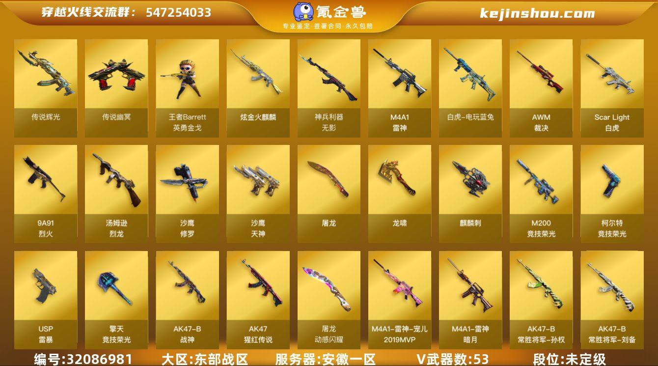 安徽一区-58V-3王者武器数-1炫金武器数 【传说武器】:传说辉光,传说幽冥 【热门武器】:传说辉光,传说幽冥,Scar Light-白虎,M200-竞技荣光,白虎-电玩蓝兔,金色小号,Cat-刀锋,毒蜂,汤姆逊-烈龙*6,斯泰尔-蝴蝶,裁决-雪莉杨,USP-雷暴,沙鹰-修罗*3 【王者炫金武器】:炫金火麒麟 【音效卡】:M4A1-雷神音效卡,Scar Light-白虎音效卡 【皮肤】:裁决-流光秘银,AWM-裁决-百城联赛天津皮肤,雷神-暗月,雷神-宠儿-2019MVP,毁灭-黑大圣皮肤,毁灭-魔灵皮肤,AK47-B-常胜将军-刘备,AK47-B-常胜将军-孙权,屠龙-破浪逐光 皮肤 【角色】:雨棠,电竞教官-云悠悠,炽天使,暗夜-X,初恋灵狐,嘉年华灵狐,荆棘玫瑰,灵狐者-黄金海岸,龙儿-小淘气,麻雀,潘多拉-甜心教官,青霞仙子,职业选手 【人偶武器】:裁决-雪莉杨,王者Barrett-英勇金戈,斯泰尔-蝴蝶,加特林-机械猎手,AWM-灵狐-15周年嘉年华,海滩汪汪-巴雷特,M37-葵,COP-旗袍,Cat-刀锋,黄金迷你深渊冰龙,兔宝宝,夺魂,迷你生化手雷*2,迷你超能女侍 【暴走生化】:毒蜂 【挑战大师】:暴君乱世-超越Max 【英雄级武器】:M4A1-雷神,Scar Light-白虎,无影-神兵利器,9A91-烈火,AK-47-猩红传说*2,AK47-B-战神,QBZ-03-王者蔷薇-觉醒版,白虎-电玩蓝兔,AWM-裁决,M200-竞技荣光,王者星神-觉醒版,王者森决-觉醒版,汤姆逊-烈龙*6,沙鹰-修罗*3,沙鹰-天神,USP-雷暴,柯尔特-竞技荣光*2,屠龙,龙啸,麒麟刺,擎天-竞技荣光,高爆手雷-竞技荣光*7,闪光弹-竞技荣光*7,烟雾弹-竞技荣光*6 【道具】:冰冰企鹅背包,虎牙炫彩背包,妩媚妖姬,黄金生化钩,绿色巨人,灵魂忍者,变异宝贝,迷雾幽灵,夺命之镰,防化服*2,金色流光-枪王排位*2,枪王排位28赛季金色流光,枪王排位29赛季金色流光,电玩兔兔表情,C4-沙漠,防弹头盔*2,防弹衣*2...