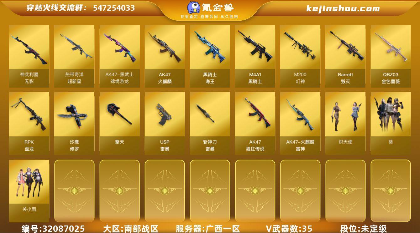 广西一区-36V-1王者武器数-0炫金武器数 【热门武器】:QBZ03-金色蔷薇,M200-幻神,死亡之眼,M4A1-黑骑士,RPK-盘龙,斯泰尔-蝴蝶,USP-雷暴,沙鹰-修罗 【音效卡】:M200-幻神音效卡 【皮肤】:幻神-宠儿-2021MVP,幻神-电流骇客 皮肤,火麒麟-雷神,火麒麟-心动糖果 【角色】:葵,关小雨,奇洋探员,炽天使,暗夜-X,初恋灵狐,电竞少女,飞虎队-X,虎妞,嘉年华灵狐,兰妹妹,猎狐者-追月,灵狐-花神,灵狐者-X,灵狐者-黄金海岸,麻雀,曼陀罗-X,曼陀罗-礼服,萌儿,潘多拉-X,青霞仙子,斯沃特-X,兔囡囡,新娜塔莎,夜玫瑰-幻能朋克,樱-战斗天使,游珑儿 【人偶武器】:斯泰尔-蝴蝶,巴雷特-零-水下丽影,AWM-灵狐-15周年嘉年华,迷你深渊冰龙 【暴走生化】:异变清道夫,死亡之眼,超级对讲机 【挑战大师】:神圣爆裂者III*3,冰龙粉碎者-白马银枪,神圣爆裂者-末日III 【英雄级武器】:AK47-火麒麟,M4A1-黑骑士,无影-神兵利器,黑武士-锦绣游龙,超新星-热带奇洋,QBZ03-金色蔷薇,王者之武-觉醒版,AK-47-猩红传说,黑骑士-海王,Barrett-毁灭,M200-幻神,RPK-盘龙,沙鹰-修罗,USP-雷暴,擎天,龙啸-热带奇洋,斩神刀-雷暴,高爆手雷-雷暴*4,高爆手雷-云龙,手雷-热带奇洋,闪光弹-雷暴*5,闪光弹-云龙,烟雾弹-雷暴*5,烟雾弹-云龙 【道具】:奇洋探员-海龟背包,热带奇洋炫彩背包,超级背包,绿色巨人,灵魂忍者,变异宝贝,迷雾幽灵,生化弹匣,夺命之镰,防化服*2,金色流光-枪王排位*2,星辰流光-枪王排位,枪王排位28赛季金色流光,热带奇洋表情,防弹头盔*5,防弹衣*5,C4工具钳*3,手雷包*2 【特殊枪械】:蝴蝶斯泰尔+0烈龙,1黑骑士,1盘龙,1蝴蝶斯泰尔