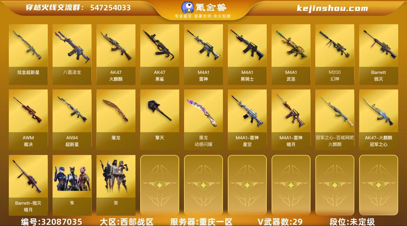 重庆一区-34V-0王者武器数-1炫金武器数 【热门武器】:M200-幻神,柯尔特-荣耀世冠白鲨2023,八面凌龙,死亡之眼,M4A1-黑骑士,加特林-炼狱 【王者炫金武器】:炫金超新星 【音效卡】:M200-幻神音效卡,死神-雪域霜狐-怀旧音效卡 【皮肤】:幻神-荣耀世冠白鲨2023 皮肤,幻神-AG-CFPL S24冠军 皮肤,裁决-巅峰荣耀 皮肤,裁决-羽掣 皮肤,雷神-暗月,雷神-荣耀之魄,雷神-星空,火麒麟-冠军之心,毁灭-暗月,毁灭-雪域霜狐 皮肤,八面凌龙-星守炎龙 皮肤,八面凌龙-森林领主 皮肤,八面凌龙-封心寒雪 皮肤,炼狱-星空,屠龙-星耀 皮肤 【角色】:葵,隼,战地猎狐,雪域霜狐,奇洋探员,乔伊教练,芳心审判者,玫瑰花神,兔囡囡,维纳斯,智影 【人偶武器】:天龙-曼陀罗,迷你钢铁终结者 【暴走生化】:死亡之眼,超级对讲机 【英雄级武器】:AK47-火麒麟*2,M4A1-雷神,M4A1-黑骑士,AN94-超新星,M4A1-武圣,AK47-黑鲨,八面凌龙,死神-雪域霜狐,Barrett-毁灭,AWM-裁决,M200-幻神,加特林-炼狱,柯尔特-荣耀世冠白鲨2023,屠龙,擎天,高爆手雷-雷暴,闪光弹-雷霆,烟雾弹-雷霆,烟雾弹-雷暴,M4A1-赤狱骑士 【道具】:亚洲杯纪念炫彩背包,战舰背包,炫彩背包-诺拉,背包-洛丽塔,雪域霜狐炫彩背包,救世主-黑桃战神,黄金生化钩,绿色巨人,灵魂忍者,迷雾幽灵,夺命之镰,防化服*2,流光-再燃火线,枪王排位29赛季金色流光,语音特效-怀旧,雪域霜狐表情,C4-黑曜,防弹头盔*2,防弹衣*2,C4工具钳*2,手雷包*2 【特殊枪械】:1黑骑士,1炼狱
