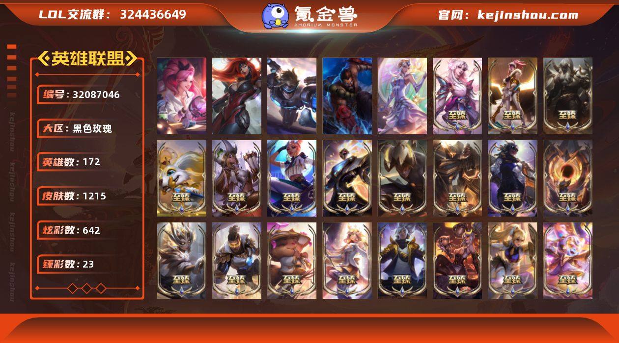 t37321【黑色玫瑰】1215皮肤 642炫彩 23臻彩 63神话/233限定/111传说/172英雄 账号等级:1047 云顶神话:1 单双排段位:翡翠 【重要头像】爱意绵绵 爱情之歌 心型钥匙 觅心游侠卢锡安 觅心之翼奎因 雪花 耀星女神拉克丝 黎明使者索拉卡 冬境仙灵妮蔻 暗星女王拉克丝 萨勒芬妮超级巨星 萨勒芬妮独立音乐人 小希 我麦是开的么 魔女阿狸 咖啡甜心茶杯朵尔 泳池派对佐伊 黎明使者卡尔玛 击拳 救生圈 KDA卡莎BAEST KDA卡莎 KDA阿卡丽 KDA阿狸 KDA伊芙琳 KDA萨勒芬妮 小库 小崎 糖果大战伊芙琳 幻灵战斗队长厄运小姐 灵魂莲华阿狸 魄罗宇航员 永恒之森阿狸 灵魂莲华莉莉娅 灵魂莲华卡西奥佩娅 太空律动拉克丝炫彩 太空律动拉克丝 小望与小牙 幼犬内瑟斯 魔女乐芙兰 太空律动格温炫彩 太空律动格温 青花瓷伊泽瑞尔 冠军蔷薇乐芙兰 沐浴震惊 女帝卡特琳娜 女帝卡特琳娜炫彩 可爱安妮 烈焰美人薇恩 神龙烈焰金克丝炫彩 招财进宝提莫 西部天使艾瑞莉娅 福牛守护者安妮 福牛守护者安妮炫彩 战斗学院凯特琳 战斗学院永恩 魔女莫甘娜 真实伤害艾克 真实伤害阿卡丽 真实伤害赛娜 真实伤害奇亚娜 太空律动布里茨 太空律动布里茨炫彩 不错哦 至臻幻灵战斗猫金克丝 至臻青花瓷拉克丝 至臻神凰行者霞 至臻魅惑女巫莫甘娜 至臻魔女乐芙兰 至臻太空律动璐璐 至臻战斗学院蕾欧娜 至臻福牛守护者菲奥娜 至臻女帝黛安娜 至臻星之守护者索拉卡 至臻KDA卡莎 至臻灵魂莲华提莫 至臻魔女婕拉 【重要皮肤】机神玄武盖伦至臻 灵魂莲华拉克丝至臻 天龙之子伊泽瑞尔至臻 花仙使者卡特琳娜至臻 幻灵战斗猫金克丝至臻 青花瓷拉克丝至臻 神凰行者烈羽焰凰霞至臻 魅惑女巫莫甘娜至臻 女帝黛安娜至臻 战斗学院蕾欧娜至臻 太空律动璐璐至臻 魔女婕拉至臻 魔...