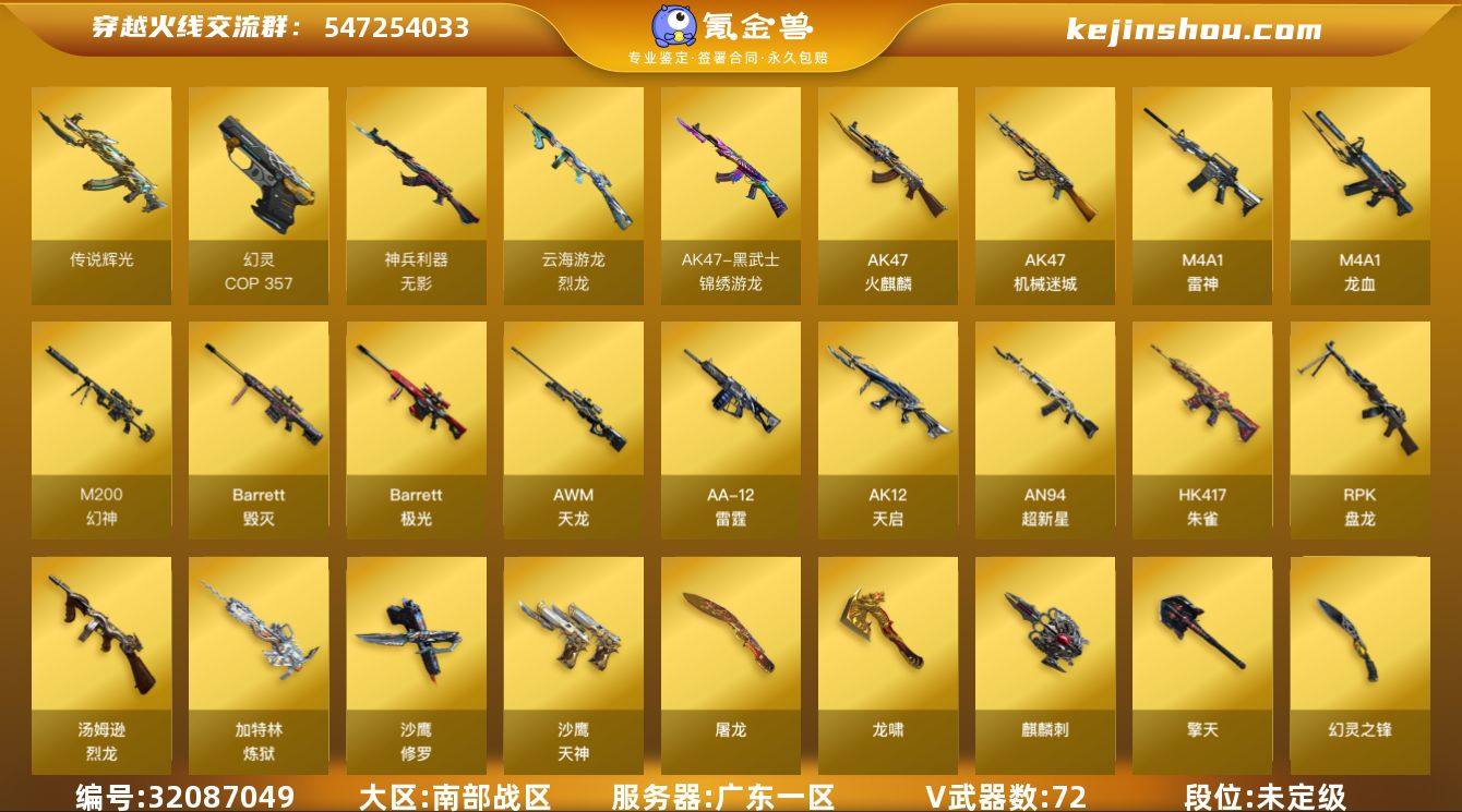 广东一区-77V-3王者武器数-1炫金武器数 【传说武器】:传说辉光 【热门武器】:传说辉光,M14EBR-玄武,HK417-朱雀,M200-幻神,Kar98K-星神,汤姆逊-烈龙*5,RPK-盘龙*6,加特林-炼狱*2,斯泰尔-蝴蝶,炼狱-枪娘掣电,COP-白鲨,COP 357-幻灵,沙鹰-修罗*4,金刚伞 【王者炫金武器】:炫金武士 【音效卡】:Barrett-极光音效卡,加特林-炼狱音效卡,AWM-昌龙-怀旧音效卡 【皮肤】:幻神-宠儿-2021MVP,幻神-纸灯龙皮肤,白虎-虎啸皮肤,金色蔷薇-枪娘阿敏 皮肤,星神-破竹皮肤,雷神-暗月,雷神-星空,雷神-虎将,雷神-源计划2.0专属 皮肤,火麒麟-雷神,火麒麟-心动糖果,毁灭耀金皮肤,毁灭-风暴,黑骑士-暗月,无影-暗月,无影-能量核心,死神-机甲核心皮肤,极光-能量核心,炼狱-月 皮肤,加特林-炼狱-钟馗皮肤,修罗-能量核心,修罗-冠军之魂,屠龙-春桃 皮肤,龙啸-冠军之啸,龙啸-纸灯龙皮肤,擎天-蒸汽钟表 皮肤 【角色】:葵,零·纪元,战地猎狐,王者葵-惊若翩鸿,王者影豹,王者潘多拉,云海玲珑,芳心审判者,风暴女*2,虎妞,嘉年华灵狐,娟娟,猎狐者-追月,灵动武士,灵狐-花神,灵狐者-黄金海岸,龙儿,麻雀,玫瑰花神,潘多拉-甜心教官,邱刚敖,斯沃特-X,铁骑荣耀,兔囡囡,新娜塔莎,夜玫瑰-幻能朋克,樱-战斗天使,影武者-X,幽,游珑儿 【人偶武器】:COP-白鲨,火麒麟-灵狐,炼狱-枪娘掣电,斯泰尔-蝴蝶,迷你地狱终结者,AWM-灵狐-15周年嘉年华,迷你深渊冰龙,迷你生化手雷*3,生化手雷-机甲核心*2,烟雾弹-迷雾幽灵,灵狐娃娃手雷 【暴走生化】:异变清道夫,双面神,超级对讲机 【挑战大师】:冰龙粉碎者-白马银枪*2 【英雄级武器】:AK47-火麒麟*2,M4A1-雷神,AK12-天启*2,AN94-超新星,AK47-机械迷城,M4A1-龙血,HK417-朱雀,M14EBR-玄武,无影-神兵利器,黑武士-锦绣游龙,QBZ-...