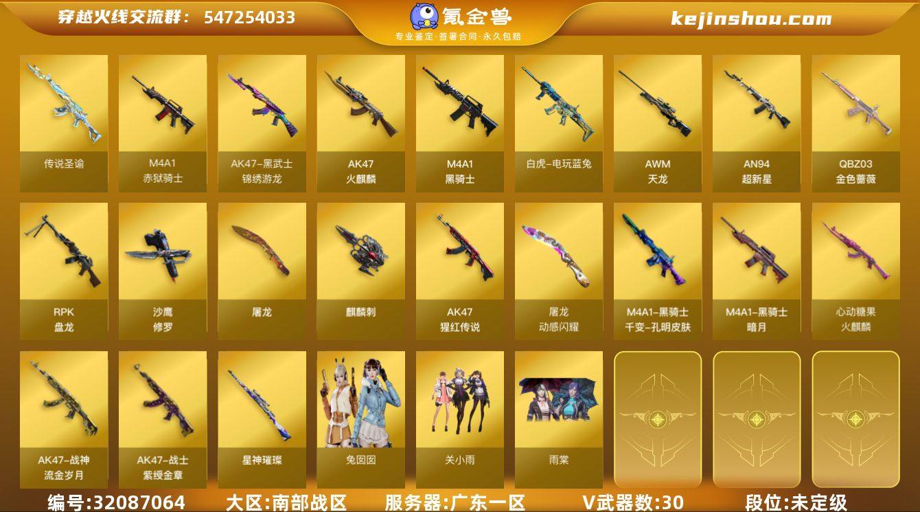 广东一区-34V-3王者武器数-0炫金武器数 【传说武器】:传说圣谕 【传说角色】:传说星骇 【热门武器】:传说圣谕,QBZ03-金色蔷薇,死亡之眼*2,白虎-电玩蓝兔,M4A1-黑骑士*2,RPK-盘龙*6,沙鹰-修罗 【王者炫金武器】:王者冰锋 【音效卡】:炼狱-百战金芒-庆典舞曲音效卡 【皮肤】:星神-璀璨皮肤,M4A1-再燃火线,火麒麟-心动糖果,M4A1-千变-孔明皮肤,黑骑士-暗月,战神-紫绶金章皮肤,战神-流金岁月皮肤,轻型军用手斧-再燃火线,麒麟刺-萌杀皮肤 【角色】:雨棠,关小雨,风暴女,嘉年华灵狐,灵狐者-X,灵狐者-黄金海岸,龙儿-小淘气,麻雀,曼陀罗-X,萌儿,斯沃特-X,铁骑荣耀,兔囡囡,雪莉杨-摸金校尉 【人偶武器】:AWM-灵狐-15周年嘉年华,黄金迷你深渊冰龙,迷你深渊冰龙*2,迷你裂空之翼*3,黄金迷你裂空之翼,迷你波特博士*5,迷你牛牛*5,迷你火种*5,迷你生化手雷*2,深渊终结者手雷,迷你艾比,迷你超能女侍,迷你巨石泰坦-魔花研究所 【暴走生化】:双面神,死亡之眼*2,超级对讲机 【挑战大师】:暴君乱世-超越Max,神圣爆裂者III*2,冰龙粉碎者-白马银枪*2,激光毁灭者III-白马银枪,VEPR-12-金魔*2,激光毁灭者III*6,机甲撕裂者III*2,试炼破坏者III,KAC-圣炎切割者III,阐释者III*3,惩戒者III 【英雄级武器】:AK47-火麒麟,M4A1-黑骑士*2,AN94-超新星,黑武士-锦绣游龙,QBZ03-金色蔷薇,AK-47-猩红传说,白虎-电玩蓝兔,王者玄武-觉醒版,AWM-天龙*2,Barrett-金色蔷薇,RPK-盘龙*6,炼狱-百战金芒,炼狱-悦蓝-觉醒版,沙鹰-修罗,屠龙,麒麟刺*2,麒麟刺-百战金芒,M4A1-赤狱骑士 【道具】:BS战队炫彩背包,云山科技背包,背包-洛丽塔,绿色巨人,灵魂忍者*2,变异宝贝,迷雾幽灵*2,生化弹匣,夺命之镰,防化服*3,电玩兔兔表情,循环实验表情,EP战队名片,防弹头盔*4,防弹...