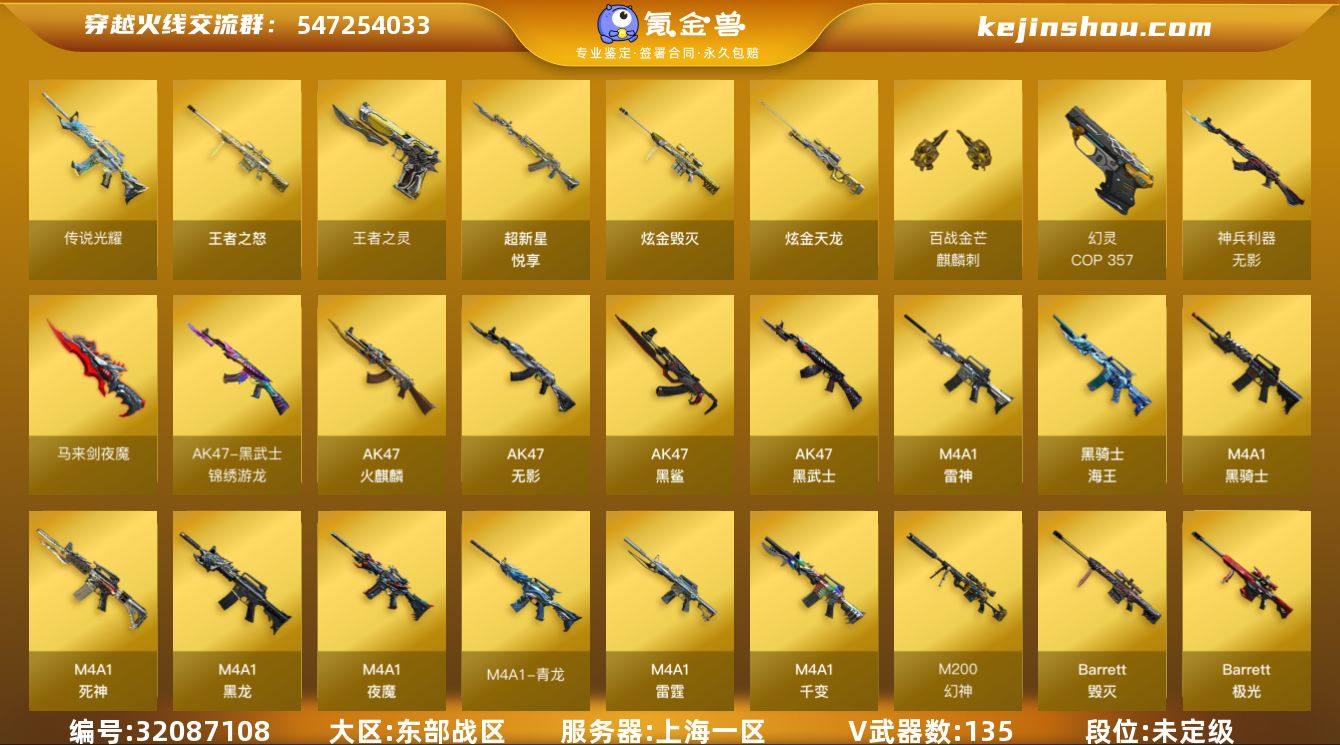 上海一区-136V-17王者-4炫金 【传说武器】:传说光耀 【热门武器】:传说光耀,QBZ03-金色蔷薇,HK417-朱雀,M4A1-青龙,M200-幻神,死亡之眼,柯尔特-冠军之特,C.A.T,M4A1-黑骑士*4,汤姆逊-烈龙*6,RPK-盘龙*6,加特林-炼狱*3,羊驼玩偶,火麒麟-绝迹,COP-白鲨,COP 357-幻灵,沙鹰-修罗*4 【王者炫金武器】:超新星-悦享,王者之怒,王者之灵,炫金骑士,炫金武士,炫金毁灭,炫金天龙 【音效卡】:天神-动感闪耀 音效卡,M200-幻神音效卡,AK47-火麒麟音效卡,M4A1-雷神音效卡,M4A1-黑龙音效卡,M4A1-黑骑士音效卡,Barrett-毁灭音效卡 【皮肤】:幻神-AG-CFPLS17冠军,M200-幻神-荣耀世冠白鲨,幻神-荣耀世冠EP 皮肤,QBZ03-荣耀世冠白鲨,QBZ03-巅峰荣耀皮肤,QBZ03-荣耀世冠EP 皮肤,裁决-叶芒苍灵 皮肤,雷神-能量核心,雷神-荣耀之魄,雷神-虎将,火麒麟-雷神,AK47-火麒麟-传奇EVEN,毁灭耀金皮肤,毁灭-星空,毁灭-冠军之怒,毁灭-CFS2020,黑龙-能量核心,黑龙-暗月,M4A1-黑龙-361,黑骑士耀金皮肤,黑骑士-冠军之势,无影-能量核心,无影耀金皮肤,战神-粉色甜心皮肤,战神-紫绶金章皮肤,战神-流金岁月皮肤,天龙-秘银,AWM-天龙-传奇70KG,AWM-天龙-传奇白鲨,极光-能量核心*2,修罗-能量核心*2,修罗-冠军之魂,屠龙-星火燎原,屠龙-春桃 皮肤,屠龙-巅峰荣耀 皮肤,龙啸-冠军之啸,擎天-冠军之击,麒麟刺-荣耀世冠白鲨 【角色】:炫,王者-零-国色天香,王者春,王者-魅影,奇洋探员,云海玲珑,风暴女,嘉年华灵狐,兰-海滩派对,兰-新年限定,零-水下丽影,灵狐者-黄金海岸,潘多拉-X,潘多拉-甜心教官,斯沃特-X,蜀雪,铁骑荣耀,兔囡囡,影武者-X,雅典娜 【人偶武器】:火麒麟-绝迹,COP-白鲨,斯泰尔-枪娘暗刃,迷你地狱终结者,AWM-灵狐-15周年嘉年华,COP-旗袍,C.A.T,迷你深渊冰...