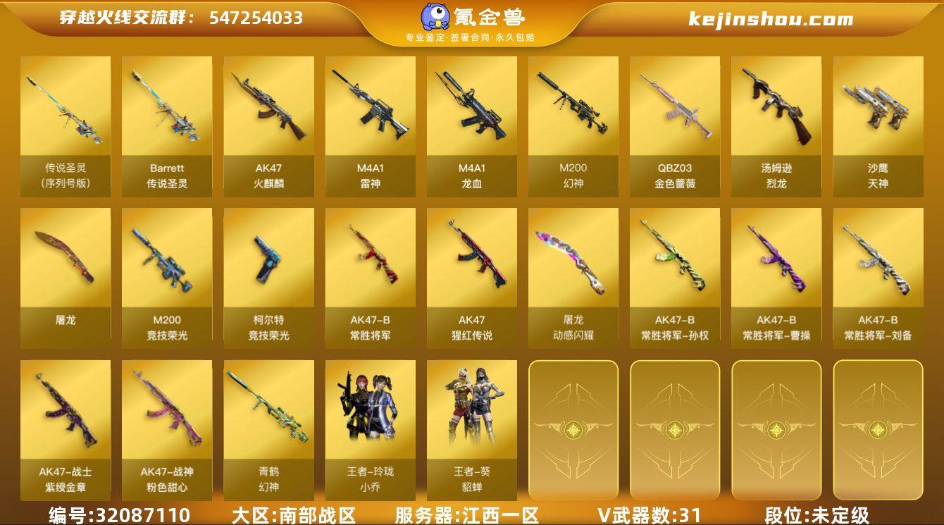 江西一区-36V-5王者武器数-0炫金武器数 【传说武器】:传说圣灵 【热门武器】:传说圣灵,QBZ03-金色蔷薇,M200-幻神,M200-竞技荣光,汤姆逊-烈龙*5,加特林-炼狱 【音效卡】:M200-幻神音效卡 【皮肤】:幻神-青鹤,雷神-烈虎皮肤,战神-粉色甜心皮肤,战神-紫绶金章皮肤,AK47-B-常胜将军-曹操,AK47-B-常胜将军-刘备*2,AK47-B-常胜将军-孙权 【角色】:王者-葵-貂蝉,王者玲珑-小乔,暗夜-X,北极狐-X,初恋灵狐,嘉年华灵狐,娟娟,葵-赛博朋克,莎莎,斯沃特-X,铁骑荣耀 【人偶武器】:AWM-灵狐-15周年嘉年华,迷你生化手雷,闪光弹-小乔,闪光弹-貂蝉,高爆手雷-大乔 【挑战大师】:激光毁灭者III-白马银枪 【英雄级武器】:AK47-火麒麟,M4A1-雷神,M4A1-龙血,QBZ03-金色蔷薇,AK-47-猩红传说,AK47-B-常胜将军,M200-幻神,M200-竞技荣光,加特林-炼狱,汤姆逊-烈龙*5,沙鹰-天神*5,柯尔特-竞技荣光,屠龙,王者之啸-觉醒版*3,王者之击-觉醒版*2,高爆手雷-竞技荣光*2,闪光弹-竞技荣光,烟雾弹-竞技荣光*3,M4A1-赤狱骑士 【道具】:炫彩背包,背包-葫芦兄弟,超级背包,夺命之镰,防化服,金色流光-枪王排位*2,枪王排位29赛季金色流光,防弹头盔,防弹衣,C4工具钳,手雷包 【特殊枪械】:5烈龙,1炼狱