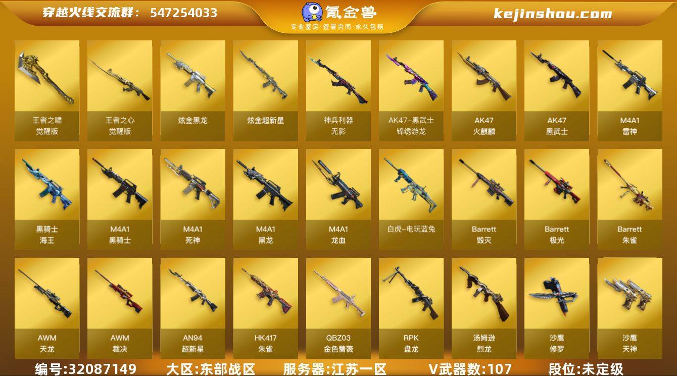 江苏一区-115V-11王者武器数-4炫金武器数 【热门武器】:QBZ03-金色蔷薇*2,HK417-朱雀,M200-竞技荣光,荣耀世冠-雷神,白虎-电玩蓝兔,M4A1-黑骑士*3,汤姆逊-烈龙*5,RPK-盘龙*2,加特林-炼狱*2,沙鹰-修罗*6,荣耀世冠-龙啸*2 【王者炫金武器】:炫金黑龙,炫金武士*2,炫金超新星 【音效卡】:AK47-火麒麟音效卡,M4A1-雷神音效卡,M4A1-黑骑士音效卡,Barrett-毁灭音效卡 【皮肤】:雷神-暗月,雷神-耀金皮肤,雷神-机甲刑天皮肤,火麒麟-AG战队皮肤,火麒麟-冠军之心,火麒麟-华夏之心,火麒麟-百城,火麒麟-心动糖果,毁灭耀金皮肤,毁灭-星空,毁灭-黑大圣皮肤,黑龙-暗月,黑骑士耀金皮肤,无影-能量核心*2,战神-粉色甜心皮肤*2,战神-紫绶金章皮肤*2,战神-流金岁月皮肤*2,AK47-B-常胜将军-刘备,AK47-B-常胜将军-孙权,AWM-天龙-传奇70KG,AWM-天龙-传奇白鲨,修罗-能量核心,修罗-星空,天神-暗月,屠龙-荣耀之锋 【角色】:魅影,战地猎狐,王者-零,王者复仇,奇洋探员,乔伊教练,修道士,云海玲珑,暗夜-X,初恋灵狐,飞虎队-X,风暴女,虎妞,嘉年华灵狐,疾风,荆棘玫瑰,娟娟,兰-新年限定,兰妹妹,猎狐者-追月,灵狐-花神,灵狐者-X,灵狐者-黄金海岸,灵狐者-七夕宝贝,流浪蔷薇,龙儿,龙儿-小淘气,麻雀,曼陀罗-X,娜塔莉娅,潘多拉-X,潘多拉-甜心教官,潜龙队-X,青霞仙子,斯沃特-X,蜀雪,铁骑荣耀,兔囡囡,铁扇公主-暗灵,维纳斯,新娜塔莎,雪莉杨,雪莉杨-摸金校尉,樱-战斗天使,游珑儿,智影 【人偶武器】:M4A1-雷神-精英刀锋,AWM-灵狐-15周年嘉年华,M37-葵,迷你深渊冰龙,迷你牛魔王,迷你波特博士*2,夺魂,迷你牛牛*2,迷你生化手雷,生化手雷-机甲核心*2,深渊终结者手雷,闪光弹-小乔,闪光弹-貂蝉,高爆手雷-大乔,迷你艾比,迷你超能女侍,迷你巨石泰坦-魔花研...