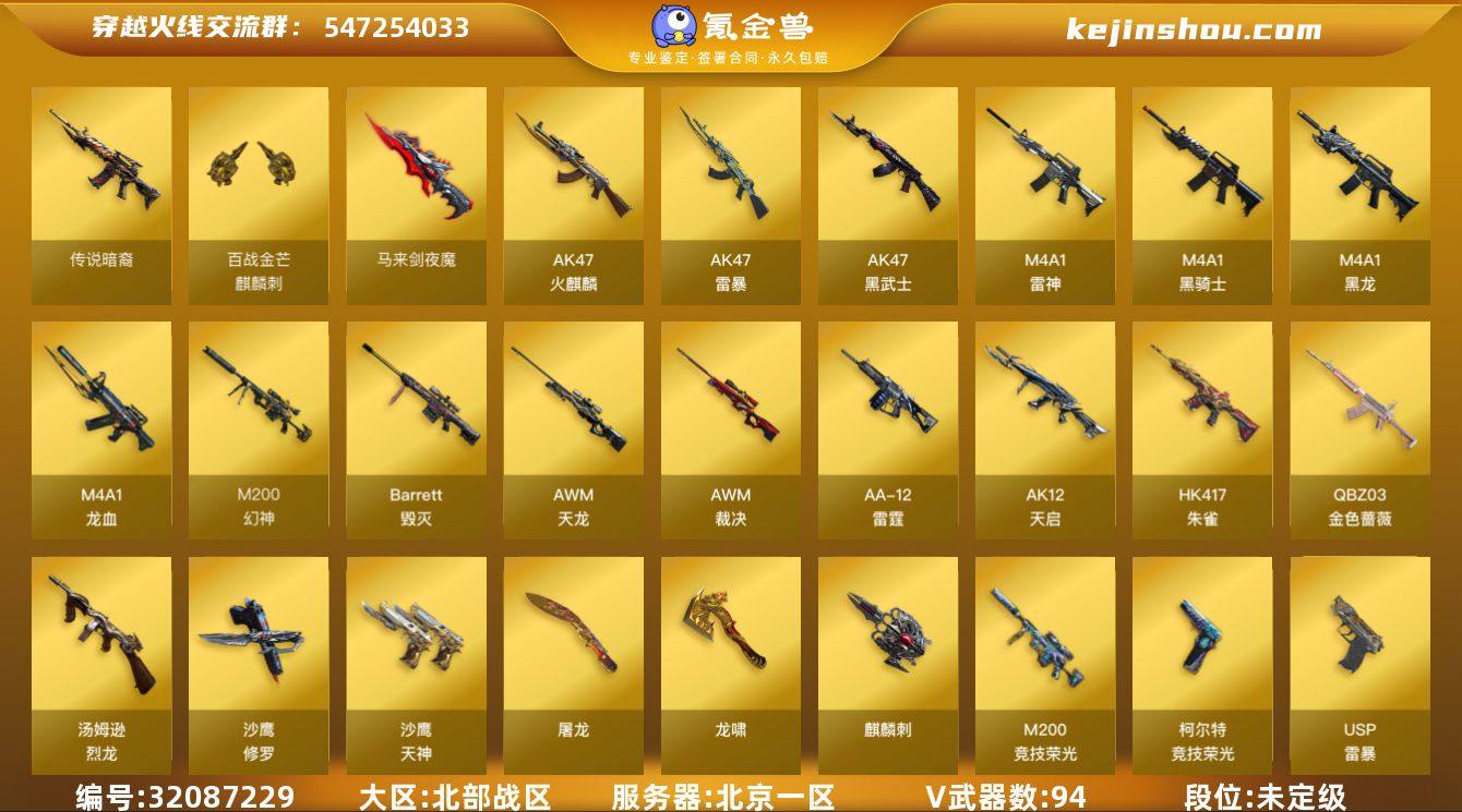 北京一区-103V-3王者武器数-1炫金武器数 【传说武器】:传说暗裔 【热门武器】:传说暗裔,QBZ03-金色蔷薇,HK417-朱雀,M200-幻神,M200-竞技荣光,M4A1-黑骑士,汤姆逊-烈龙*2,加特林-炼狱,斯泰尔-蝴蝶,裁决-雪莉杨,USP-雷暴,沙鹰-修罗*2 【王者炫金武器】:炫金武士 【音效卡】:AK47-火麒麟音效卡,M4A1-雷神音效卡,M4A1-黑骑士音效卡,Barrett-毁灭音效卡 【皮肤】:雷神-暗月,雷神-荣耀之魄,毁灭耀金皮肤,毁灭-英雄计划 皮肤,战神-紫绶金章皮肤*2,AK47-B-常胜将军-曹操 【角色】:魅影,春,电竞教官-云悠悠,战地猎狐,奇洋探员,乔伊教练,暗夜-X,娟娟,灵狐者-职业经理,潜龙队-X,邱刚敖,青霞仙子,铁骑荣耀,影武者-X,职业选手 【人偶武器】:裁决-雪莉杨,斯泰尔-蝴蝶,COP-旗袍,闪光弹-小乔,迷你超能女侍,灵狐娃娃手雷 【挑战大师】:神圣爆裂者III*2,AK47-冰龙粉碎者 【英雄级武器】:AK47-火麒麟,M4A1-黑龙,M4A1-雷神,M4A1-黑骑士,AK47-黑武士,AK12-天启,M4A1-龙血,AK47-雷暴,HK417-朱雀,QBZ03-金色蔷薇,王者之心-觉醒版,AK-47-猩红传说*2,AK47-B-战神*2,王者炎心-觉醒版,AWM-天龙,Barrett-毁灭,AWM-裁决,M200-幻神,M200-竞技荣光,Barrett-金色蔷薇,加特林-炼狱,汤姆逊-烈龙*2,AA-12-雷霆,沙鹰-修罗*2,沙鹰-天神,USP-雷暴,柯尔特-竞技荣光*2,屠龙*2,龙啸*3,马来剑-夜魔,麒麟刺,擎天-竞技荣光,斩神刀-雷暴,王者之击-觉醒版,高爆手雷-雷暴*7,高爆手雷-夜魔,高爆手雷-竞技荣光*9,闪光弹-雷暴*7,闪光弹-夜魔,闪光弹-竞技荣光*7,烟雾弹-雷暴*7,烟雾弹-夜魔,烟雾弹-竞技荣光*9,M4A1-赤狱骑士 【道具】:CFS限定背包,XROCK炫彩背包,超级背包,女皇终结者-魔龙之吻,救世主-黑桃战神,绿色巨人,灵魂忍者,迷雾幽灵,生化弹匣
