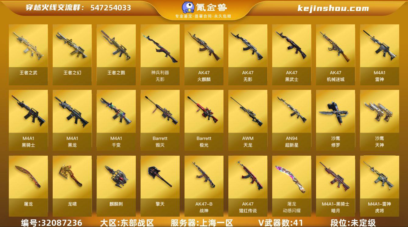 上海一区-43V-4王者武器数-0炫金武器数 【热门武器】:M4A1-黑骑士,沙鹰-修罗*7 【王者炫金武器】:王者之戮*2,王者之幻,王者之武 【皮肤】:雷神-暗月,雷神-虎将,火麒麟-雷神,黑龙-能量核心*2,黑龙-暗月,黑骑士-暗月,战神-粉色甜心皮肤,战神-紫绶金章皮肤*5,战神-流金岁月皮肤*2,天龙-秘银,极光-能量核心,修罗-能量核心,屠龙-荣耀之锋 【角色】:零,樱,王者-零,嘉年华灵狐,蜀雪,铁骑荣耀 【人偶武器】:AWM-灵狐-15周年嘉年华,闪光弹-小乔 【挑战大师】:神圣爆裂者-末日III 【英雄级武器】:M4A1-千变,AK47-火麒麟,M4A1-黑龙,M4A1-雷神*2,M4A1-黑骑士,AK47-无影,AK47-黑武士,AN94-超新星,AK47-机械迷城*3,无影-神兵利器,AK-47-猩红传说*6,AK47-B-战神,AWM-天龙*2,Barrett-毁灭,Barrett-极光,沙鹰-修罗*7,沙鹰-天神,屠龙*4,龙啸,擎天,麒麟刺 【道具】:战舰背包,炫彩背包,超级背包,夺命之镰,防化服,防弹头盔*5,防弹衣*5,C4工具钳*5,手雷包*5 【特殊枪械】:1黑骑士