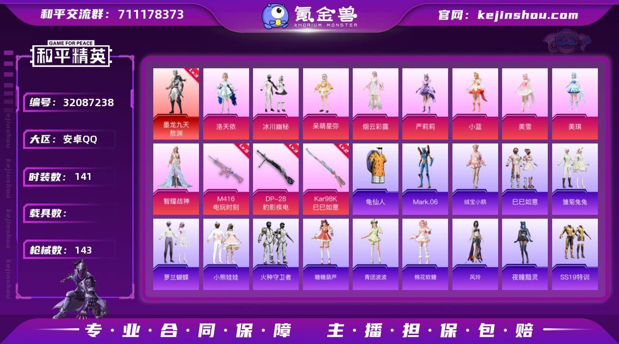 【特价出售】【还有148扭蛋碎片】【永久包售后!!!】安卓 手Q-1神装-9粉装-3特效枪-0载具-3粉色飞行器-49939热力值-6王牌印记-141套装-143枪皮 【红色神装等级】:墨龙九天-敖渊(三级) 【红色角色神装】:墨龙九天-敖渊 【热门品类】:套装-龟仙人,角色-Mark.06 【粉色套装】:角色-洛天依,粉装-冰川幽秘,角色-呆萌星弥,角色-烟云彩露,角色-严莉莉,角色-小蓝,角色-美雪,角色-美琪,角色-智耀战神 【粉色枪皮等级】:M416-电玩时刻(五级),Kar98K-巳巳如意(二级),DP-28-豹影疾电(三级) 【粉色枪皮】:M416-电玩时刻,Kar98K-巳巳如意,DP-28-豹影疾电 【粉色飞行器】:幻海精灵飞行器,深渊漩涡飞行器 【粉色降落伞】:冰川粉黛降落伞,音爆索尼克降落伞,萌物绒绒降落伞,圣堂之誓降落伞,江南烟雨降落伞,巴啦啦小魔仙降落伞,幻彩电音降落伞 【稀有套装】:套装-龟仙人,套装-绒宝小鹅,套装-巳巳如意,套装-雏菊兔兔,套装-萝兰蝴蝶,套装-小熊娃娃,套装-火种守卫者,套装-糖糖葫芦,套装-青团波波,套装-棉花软糖,角色-风玲,角色-夜瞳黯灵 【稀有枪皮】:AKM-春暖花开,AKM-破晓战魂,AKM-龙的传人,M16A4-幻世战舞者,M16A4-甜心亚梦,SCAR-L-玉兔迎春,SCAR-L-粉锦千层,M416-糯团青竹,M416-红色方程式,M416-蓝色火焰,GROZA-田园牧歌,AUG-耀粉歌者,M762-天降萌叽,Mk47-妙红点点,AC-VAL-天降萌叽,AC-VAL-快闪甜心,AC-VAL-甜心亚梦,蜜獾-天降萌叽,蜜獾-娇憨猪猪,Famas-墨龙九天,UZI-天降萌叽,UZI-娇憨猪猪,UMP45-生命誓言,UMP45-绒宝小鹅,Vector-焰鹰斗篷,Vector-生命誓言,Vector-田园牧歌,Vector-音爆索尼克,汤姆逊-天降萌叽,汤姆逊-耀粉歌者,P90-快闪甜心,P90-巳巳如意,Kar98K-彩虹符号,Kar98K-炫彩节奏,Kar98K-星穹咏叹调,M24-影袭,AWM-焰鹰斗篷,SKS-天之羽翼...