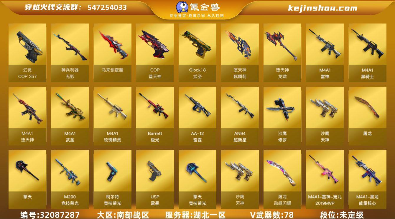 湖北一区-84V-5王者武器数-0炫金武器数 【热门武器】:M200-竞技荣光,M4A1-黑骑士*5,USP-雷暴,COP-堕天神*3,COP 357-幻灵,沙鹰-修罗*2 【王者炫金武器】:王者玉锋 【音效卡】:Barrett-极光音效卡 【皮肤】:雷神-宠儿-2019MVP,雷神-源计划2.0专属 皮肤,毁灭-魔灵皮肤,毁灭-秦师 皮肤,黑龙-能量核心,AK47-B-常胜将军-曹操*2,AK47-B-常胜将军-刘备*2,AK47-B-常胜将军-孙权,极光-能量核心*2,修罗-能量核心,屠龙-荣耀世冠AG 【角色】:迷迭香,电竞教官-云悠悠,奇洋探员,暗夜-X,初恋灵狐,芳心审判者,风暴女,嘉年华灵狐,灵狐者-X,灵狐者-职业经理,龙儿-小淘气,潘多拉-X,潘多拉-甜心教官,斯沃特-X,铁骑荣耀 【人偶武器】:巴雷特-零-水下丽影,AWM-灵狐-15周年嘉年华,深渊终结者手雷,闪光弹-貂蝉,高爆手雷-大乔,Barrett-夜玫瑰,QBZ03-斯沃特,灵狐娃娃手雷 【挑战大师】:暴君乱世-超越Max,神圣爆裂者III,冰龙粉碎者-白马银枪*2,激光毁灭者III-白马银枪,VEPR-12-金魔,激光毁灭者III,机甲撕裂者III,神圣爆裂者-末日III,阐释者III 【英雄级武器】:M4A1-雷神,M4A1-黑骑士*5,AN94-超新星,M4A1-武圣,M4A1-堕天神,无影-神兵利器,M4A1-玫瑰精灵,QBZ-03-王者蔷薇-觉醒版,Barrett-极光,M200-竞技荣光,王者之光-觉醒版,王者风神-觉醒版,AA-12-雷霆,沙鹰-修罗*2,沙鹰-天神,USP-雷暴,COP-堕天神*3,COP 357-幻灵,柯尔特-竞技荣光,Glock18-武圣,屠龙*2,麒麟刺-堕天神,马来剑-夜魔,擎天*3,擎天-竞技荣光*2,龙啸-堕天神,高爆手雷-堕天神*7,高爆手雷-夜魔,高爆手雷-幻灵,高爆手雷-竞技荣光*6,闪光弹-堕天神*7,闪光弹-夜魔,闪光弹-竞技荣光*5,闪光弹-雷霆王者-觉醒版,烟雾弹-堕天神*7,烟雾弹-夜魔,烟雾弹-竞技荣光*6 【道