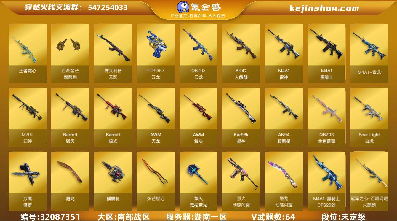 湖南一区-70V-12王者武器数-0炫金武器数 【热门武器】:QBZ03-金色蔷薇,M14EBR-玄武,Scar Light-白虎,M4A1-青龙,M200-幻神,柯尔特-冠军之特*2,Kar98K-星神,M4A1-黑骑士,羊驼玩偶*2,毁灭-孙三炮,沙鹰-修罗*2,Knife-冠军之刃,炽芒蝶刃,炽芒蝶刃-破浪逐光 皮肤 【王者炫金武器】:王者霜心,王者冰锋 【音效卡】:Scar Light-白虎音效卡,M14EBR-玄武音效卡 【皮肤】:幻神-宠儿-2021MVP,幻神-动感闪耀 皮肤,幻神-AG-CFPL S24冠军 皮肤,白虎-大汉风骨,白虎-霓虹机甲 皮肤,白虎-白鲨-CFPLS23冠军,QBZ03-冠军之薇,QBZ03-荣耀世冠白鲨,裁决-巅峰荣耀 皮肤,星神-璀璨皮肤,雷神-荣耀之魄,火麒麟-冠军之心,火麒麟-平天大圣,火麒麟-心动糖果,毁灭-荣耀之怒,毁灭-冠军之怒,毁灭-直播专属,黑骑士-CFS2021,屠龙-荣耀之锋,屠龙-星火燎原,擎天-冠军之击*2,炽芒蝶刃-破浪逐光 皮肤 【角色】:葵,王者零-华冠丽服,王者樱-热浪之夏,乔伊教练,云海玲珑,飞虎队-X,虎妞,嘉年华灵狐,猎狐者-追月,灵狐者-X,麻雀,曼陀罗-礼服,玫瑰花神,潘多拉-X,潘多拉-甜心教官,莎莎,斯沃特-X,铁骑荣耀,兔囡囡,五号兵器-赛博朋克,雪莉杨-摸金校尉,樱-战斗天使,幽 【人偶武器】:毁灭-孙三炮,AWM-灵狐-15周年嘉年华 【暴走生化】:超级对讲机 【挑战大师】:激光毁灭者III 【英雄级武器】:AK47-火麒麟,M4A1-雷神,M4A1-黑骑士,AN94-超新星,M4A1-青龙,Scar Light-白虎,M14EBR-玄武,无影-神兵利器,QBZ03-云龙,QBZ03-金色蔷薇,烈火-动感闪耀,王者之戮-觉醒版,王者冰魄-觉醒版,王者白虎-觉醒版,白虎之魄-觉醒版,AWM-天龙,Barrett-毁灭,Barrett-极光,AWM-裁决,M200-幻神,Kar98K-星神,王者之决-觉醒版,沙鹰-修罗*2,柯尔特-冠军之特*2,COP 357-