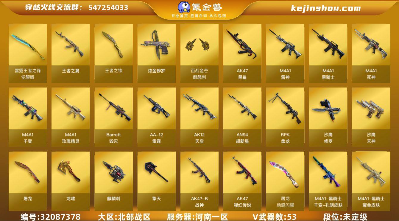 河南一区-58V-2王者武器数-2炫金武器数 【热门武器】:死亡之眼,M4A1-黑骑士*2,RPK-盘龙*4,加特林-炼狱,沙鹰-修罗*2 【王者炫金武器】:王者之翼,王者之锋,炫金骑士,炫金修罗 【音效卡】:M4A1-黑骑士音效卡,Barrett-毁灭音效卡 【皮肤】:雷神-源计划2.0专属 皮肤,火麒麟-雷神*2,毁灭-星空,毁灭-英雄计划 皮肤,M4A1-千变-孔明皮肤,黑骑士-暗月,黑骑士耀金皮肤,战神-粉色甜心皮肤*2,战神-紫绶金章皮肤*5,战神-流金岁月皮肤*5 【角色】:零,空,初恋灵狐,潘多拉-X,潜龙队-X,蜀雪,新娜塔莎,影武者-X 【人偶武器】:迷你深渊冰龙,迷你生化手雷,闪光弹-小乔 【暴走生化】:死亡之眼 【挑战大师】:AK47-冰龙粉碎者,激光毁灭者III,阐释者III 【英雄级武器】:M4A1-千变*2,M4A1-雷神,M4A1-黑骑士*2,M4A1-死神,AK12-天启,AN94-超新星,AK47-黑鲨,M4A1-玫瑰精灵*2,AK-47-猩红传说*6,AK47-B-战神,Barrett-毁灭*4,RPK-盘龙*4,加特林-炼狱,AA-12-雷霆,沙鹰-修罗*2,沙鹰-天神,屠龙*2,龙啸,擎天,麒麟刺 【道具】:战舰背包,超级背包,绿色巨人,灵魂忍者,变异宝贝,迷雾幽灵,夺命之镰,防化服*2,金色流光-枪王排位,星辰流光-枪王排位,防弹头盔*8,防弹衣*8,C4工具钳*7,手雷包*5 【特殊枪械】:2黑骑士,4盘龙,1炼狱