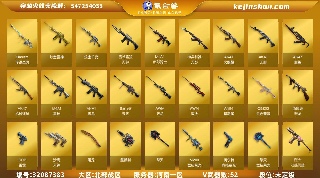 河南一区-56V-10王者-2炫金 【传说武器】:传说圣灵 【热门武器】:传说圣灵,QBZ03-金色蔷薇,M200-竞技荣光,汤姆逊-烈龙,裁决-雪莉杨 【王者炫金武器】:炫金千变,炫金雷神 【音效卡】:AK47-火麒麟音效卡,Barrett-碧霄极光音效卡*3,炼狱-百战金芒-庆典舞曲音效卡,死神-雪域霜狐-怀旧音效卡 【皮肤】:裁决-羽掣 皮肤,雷神-暗月,雷神-能量核心,雷神-诺拉 皮肤,M4A1-再燃火线,AK47-火麒麟-传奇EVEN,火麒麟-心动糖果,毁灭-暗月,毁灭耀金皮肤,毁灭-黑大圣皮肤,毁灭-风暴*2,黑龙-能量核心,无影-能量核心,AWM-天龙-传奇70KG,轻型军用手斧-再燃火线,麒麟刺-甜蜜糖果 皮肤 【角色】:炫,电竞教官-云悠悠,战地猎狐,雪域霜狐,乔伊教练,修道士,暗夜-X,初恋灵狐,风暴女,嘉年华灵狐,疾风,灵狐者-X,龙儿,潜龙队-X,斯沃特-X,兔囡囡,维纳斯,雪莉杨-摸金校尉,智影 【人偶武器】:裁决-雪莉杨,火麒麟-灵狐,AWM-灵狐-15周年嘉年华,迷你深渊冰龙,迷你裂空之翼*2,迷你波特博士,迷你牛牛,迷你艾比 【挑战大师】:神圣爆裂者III,激光毁灭者III-白马银枪,激光毁灭者III,KAC-圣炎切割者III,神圣爆裂者-末日III*2 【英雄级武器】:AK47-火麒麟*2,M4A1-黑龙,M4A1-雷神,AK47-无影,AN94-超新星,AK47-机械迷城,AK47-黑鲨*4,无影-神兵利器,死神-雪域霜狐,QBZ03-金色蔷薇,烈火-动感闪耀,王者之翼-觉醒版,超新星-悦享-觉醒版,王者之烈-觉醒版,AWM-天龙,Barrett-毁灭*6,AWM-裁决,M200-竞技荣光,炼狱-百战金芒,汤姆逊-烈龙,沙鹰-天神,COP-雷霆,柯尔特-竞技荣光,天神-动感闪耀,屠龙,擎天,麒麟刺,擎天-竞技荣光*2,屠龙-动感闪耀,麒麟刺-百战金芒,雷霆王者之锋-觉醒版*2,高爆手雷-竞技荣光*3,手雷-动感闪耀,闪光弹-竞技荣光*3,烟雾弹-竞技荣光*3,M4A1-赤狱骑士...