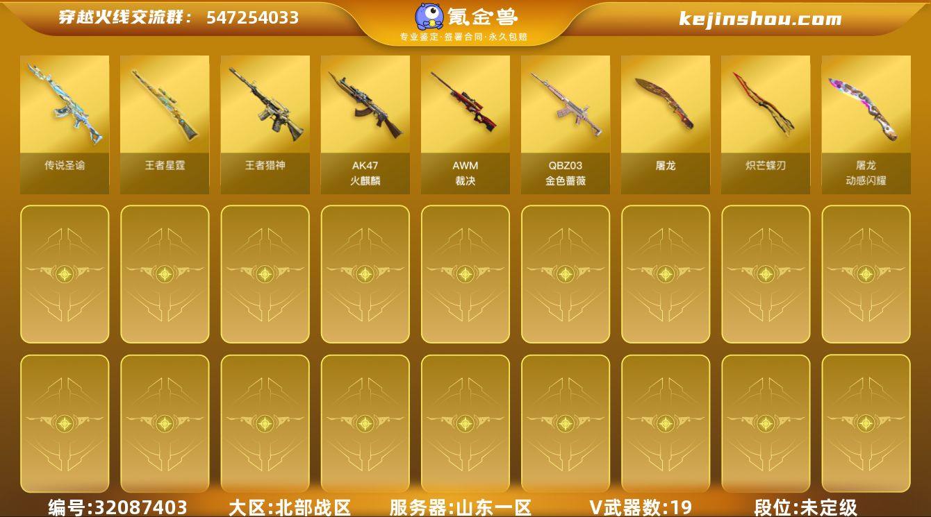 山东一区-19V-2王者武器数-0炫金武器数 【传说武器】:传说圣谕 【热门武器】:传说圣谕,QBZ03-金色蔷薇,柯尔特-冠军之特,炽芒蝶刃 【王者炫金武器】:王者猎神,王者星霆 【音效卡】:AWM-裁决音效卡,炼狱-百战金芒-庆典舞曲音效卡 【皮肤】:裁决-运输船 皮肤,M4A1-再燃火线,屠龙-星火燎原*2,轻型军用手斧-再燃火线 【角色】:修道士,芳心审判者,灵狐者-X,麻雀,潘多拉-X,夜玫瑰-幻能朋克,智影 【人偶武器】:M4A1-雷神-精英刀锋,AWM-灵狐-15周年嘉年华*2,灵狐娃娃手雷 【英雄级武器】:AK47-火麒麟,QBZ03-金色蔷薇,AWM-裁决,Barrett-金色蔷薇,柯尔特-冠军之特,屠龙,炽芒蝶刃,麒麟刺-百战金芒,高爆手雷-云龙*2,闪光弹-云龙*2,烟雾弹-云龙*2,M4A1-赤狱骑士 【道具】:亚洲杯纪念炫彩背包,百战金芒炫彩背包,女皇终结者-魔龙之吻,救世主-黑桃战神,绿色巨人,灵魂忍者,迷雾幽灵,生化弹匣,夺命之镰,防化服*3,枪王排位28赛季金色流光,热带奇洋打击特效,萌萌小葵表情,防弹头盔*4,防弹衣*4,C4工具钳*4,手雷包*4 【特殊枪械】: