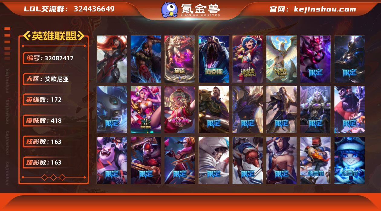 WL542【电信艾欧尼亚 2终极 6神话 4王者 3典藏 7臻彩】172英雄-418皮肤-163炫彩-段位:铂金 【终极】武装战姬厄运小姐 灵魂守卫乌迪尔【神话】十五周年纪念希维尔 至臻神龙尊者均衡之龙沃利贝尔 源代码乐芙兰 十周年纪念安妮 神凰行者瑞羽圣凰艾尼维亚 海克斯科技雷克顿【王者】星空之门内瑟斯 死亡骑士内瑟斯 西部牛仔崔斯特 五杀摇滚鼓手奥拉夫【典藏】宗师级锻造训练师波比 法老阿木木 钢铁终结者塞恩【臻彩】冠军之影劫凯旋圣装 天龙之子卡莎飞龙乘云 魔女阿卡丽虚荣 净雪之月莫甘娜冬虹 神龙尊者圣龙李青登龙 可爱可爱粉红红布里茨 无畏骑士瑟庄妮赤子初心【皮肤】灵魂守卫 武装战姬 至臻神龙尊者均衡之龙 沃利贝尔 创星之灵璐璐 都铎王朝老鼠 勇者阿狸 穿星魔锋赵信 海克斯雷克顿 福牛守护者佛耶戈 龙年盲僧 羊年金克丝 10周年安妮 10周年神凰行者瑞羽圣凰艾尼维亚 3周年女枪 甜心宝贝安妮 寒冬精灵璐璐 冰雪节炼金 胡桃夹子小丑 魄罗骑士瑟庄妮 圣诞开心鬼提莫 圣诞精灵崔丝塔娜 圣诞狂欢努努 圣诞老人酒桶 圣诞糖果棒女枪 圣诞玩偶波比 胜利枪神格雷福斯 胜利之剑剑魔 胜利枪神卢锡安 胜利女神瑟庄妮 S2暗杀星蒙多 S2暗杀星努努 S3SKTT1劫 S3SKTT1婕拉 S4SSW泰隆 S4SSW老鼠 S7SSG洛 地狱行者孙悟空 鬼影重重魔腾 灵魂收割者奶妈 钢铁军团盖伦 陆地王者4WD布里茨 灵魂莲华瑟提 神王盖伦 幻灵战斗队长女枪 源计划:联合艾希 西部天使艾希 奥德赛凯隐 恶魔之刃蛮王 黎明使者锐雯 黑夜使者亚索 地狱之门卫士加里奥 魔幻卡牌崔斯特 暗星尊烬 黯黑魔龙希瓦娜 冰霜亚龙希瓦娜 战地机甲厄加特 神拳李青 星之守护者金克丝 战地巨兽科加斯 西部魔影卢锡安 银河魔装机神兰博 天煞劫 黯晶凤凰艾尼维亚 第三类接触黑默丁格 大天使长米迦勒凯尔 战场女武神凯尔 炼狱魔犬内瑟斯 源计划剑圣 电玩女神娑娜 恶魔男爵瑞兹 女主...