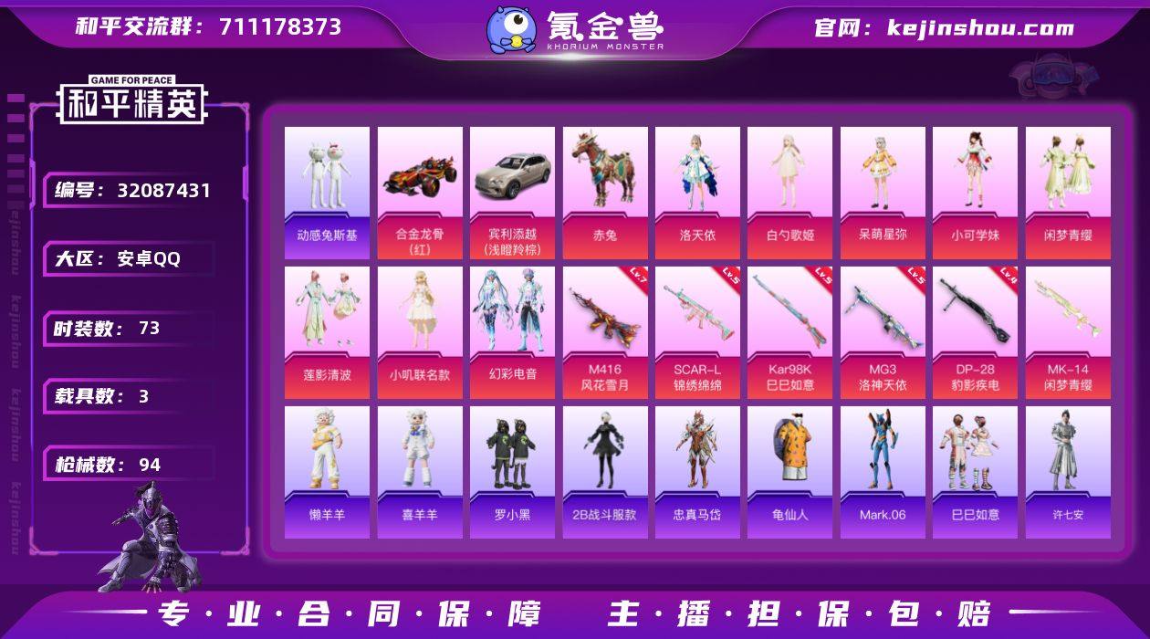 安卓 【男神号 2B战斗服款/Mark.06/洛天依/SCAR-L-锦绣绵绵(五级)/M416-风花雪月(七级)/宾利添越(浅瞪羚棕)/合金龙骨(红)/赤兔】手Q-8粉装-6特效枪-3载具-1粉色飞行器-39297热力值-1王牌印记-73套装-94枪皮 【热门品类】:套装-动感兔斯基人偶服,角色-2B战斗服款,角色-忠真马岱,套装-龟仙人,角色-Mark.06,大砍刀-青龙偃月刀,撬棍-龙胆亮银枪 【粉色套装】:角色-洛天依,角色-白勺歌姬,角色-呆萌星弥,角色-小可学妹,粉装-闲梦青缨,粉装-莲影清波,角色-小叽联名款,粉装-幻彩电音 【粉色枪皮等级】:SCAR-L-锦绣绵绵(五级),M416-风花雪月(七级),Kar98K-巳巳如意(五级),DP-28-豹影疾电(四级),MG3-洛神天依(五级) 【粉色载具】:宾利添越(浅瞪羚棕),合金龙骨(红),赤兔 【粉色枪皮】:SCAR-L-锦绣绵绵,M416-风花雪月,Kar98K-巳巳如意,Mk14-闲梦青缨,DP-28-豹影疾电,MG3-洛神天依 【粉色飞行器】:镜域双华-灵镜之阶 【粉色降落伞】:洛神天依降落伞,闲梦青缨降落伞,炫光之旅降落伞,莲影清波降落伞,龙行天下降落伞,镜域双华降落伞,精灵梦叶罗丽降落伞,幻彩电音降落伞,喜羊羊与灰太狼降落伞 【稀有套装】:套装-龟仙人,套装-巳巳如意,角色-许七安,套装-燕燕于飞,套装-鱼渊荷华,玩偶服-懒羊羊,玩偶服-喜羊羊 【稀有枪皮】:AKM-江南烟雨,AKM-破晓战魂,AKM-霓虹街区,AKM-龙的传人,SCAR-L-夜灯,M416-蓝色火焰,GROZA-2B战斗服款,AUG-2P战斗服款,AUG-怪笑疯兔,AUG-闲梦青缨,QBZ-洛神天依,QBZ-绒兔团圆,Mk47-洛神天依,Mk47-炫光之旅,G36C-镜域双华,AC-VAL-快闪甜心,AC-VAL-闲梦青缨,蜜獾-垂柳戏鸭,蜜獾-天降萌叽,UZI-啾咪啾咪,UZI-天降萌叽,Vector-焰鹰斗篷,Vector-生命誓言,汤姆逊-天降萌叽,汤姆逊-耀粉歌者,P90-倾城蜜语,P90-快闪甜心,P90-巳巳如意...