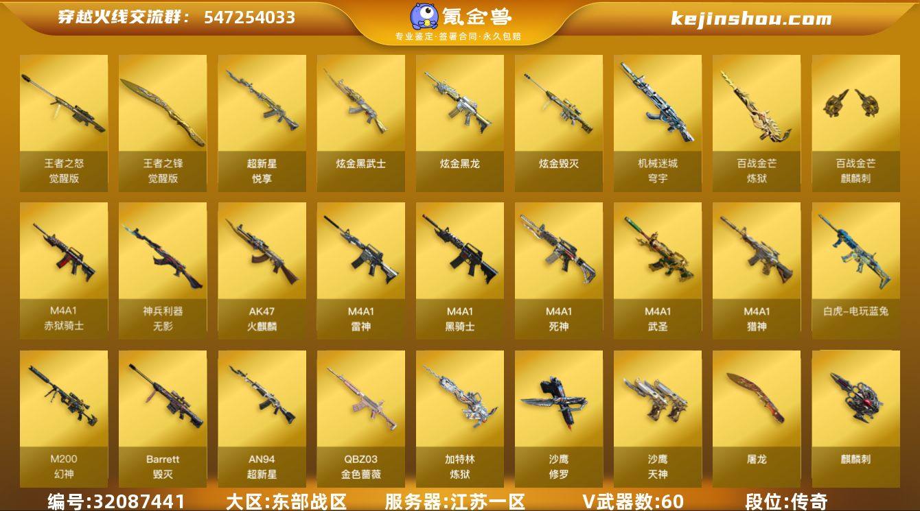 江苏一区-69V-6王者武器数-3炫金武器数 【热门武器】:QBZ03-金色蔷薇,M200-幻神,M200-竞技荣光,死亡之眼,白虎-电玩蓝兔,M4A1-黑骑士,加特林-炼狱,斯泰尔-蝴蝶,裁决-雪莉杨,COP-白鲨,USP-雷暴,沙鹰-修罗 【王者炫金武器】:超新星-悦享,炫金黑龙,炫金武士,炫金毁灭 【音效卡】:M200-幻神音效卡,AK47-火麒麟音效卡,M4A1-雷神音效卡,M4A1-黑骑士音效卡,QBZ03-金色蔷薇音效卡,HK417-朱雀音效卡,麒麟刺-百战金芒-盛典舞曲音效卡,炼狱-百战金芒-庆典舞曲音效卡 【皮肤】:M200-幻神-黄忠皮肤,M200-幻神-荣耀世冠白鲨,QBZ03-荣耀世冠白鲨,雷神-荣耀之魄,雷神-虎将,雷神-机甲刑天皮肤,M4A1-再燃火线,火麒麟-平天大圣,火麒麟-盘古,火麒麟-心动糖果,毁灭-荣耀之怒,毁灭-星空,毁灭-战神张飞,毁灭-神秘黑洞皮肤,毁灭-英雄计划 皮肤,M4A1-千变-孔明皮肤,黑骑士-伏羲,无影-霓裳皮肤,AK47-黑武士-361,战神-粉色甜心皮肤,战神-流金岁月皮肤*2,AK47-B-常胜将军-曹操*2,AK47-B-常胜将军-刘备,修罗-冠军之魂 【角色】:电竞教官-云悠悠,王者春,乔伊教练,修道士,云海玲珑,葵-阿尔法武装,幻面灵狐,空,初恋灵狐,嘉年华灵狐,灵狐-花神,龙儿-小淘气,潘多拉-X,潘多拉-甜心教官,青霞仙子,斯沃特-X,铁骑荣耀,兔囡囡,影武者-X,幽,职业选手 【人偶武器】:COP-白鲨,裁决-雪莉杨,斯泰尔-蝴蝶,AWM-灵狐-15周年嘉年华,迷你超能女侍 【暴走生化】:死亡之眼 【英雄级武器】:AK47-火麒麟*2,M4A1-雷神*3,M4A1-黑骑士,M4A1-死神*2,AN94-超新星,M4A1-武圣*2,无影-神兵利器,QBZ03-金色蔷薇,M4A1-猎神,天启-悦智-觉醒版,超新星-悦享-觉醒版,AK47-B-战神,白虎-电玩蓝兔,机械迷城-穹宇,Barrett-毁灭,M200-幻神,M200-竞技荣光,王者之怒-觉醒版,加特林-炼狱,炼狱-...