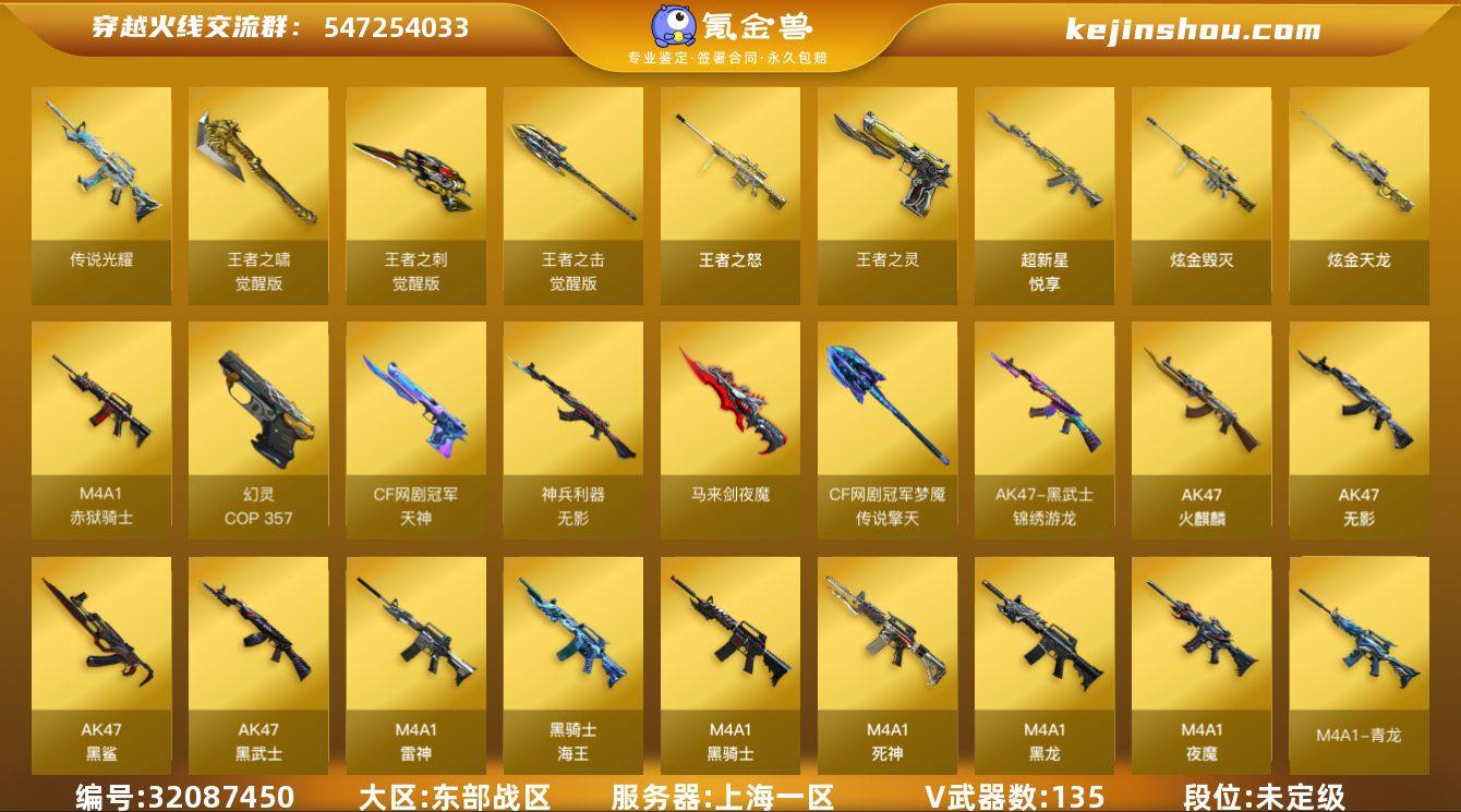 上海一区-41V-4王者-3炫金 【传说角色】:传说星骇 【热门武器】:QBZ03-金色蔷薇,M4A1-黑骑士,汤姆逊-烈龙*6,RPK-盘龙,加特林-炼狱,降世魔童,沙鹰-修罗*4 【王者炫金武器】:王者之怒,炫金黑龙,炫金雷神,炫金修罗 【音效卡】:M4A1-雷神音效卡,Barrett-毁灭音效卡 【皮肤】:裁决-羽掣 皮肤,雷神-暗月,雷神-机甲刑天皮肤,火麒麟-轻羽皮肤,毁灭-暗月,毁灭-CFS2020,毁灭-神秘黑洞皮肤,黑龙-暗月,黑骑士-暗月,黑骑士耀金皮肤,死神-秘银,天启-暗月*3,天龙-能量核心,极光-能量核心,炼狱-奇幻宇宙万象,修罗-能量核心 【角色】:零,葵,樱,乔伊教练,云海玲珑,炽天使,北极狐-X,初恋灵狐,芳心审判者,风暴女*2,零-水下丽影,灵狐者-黄金海岸,曼陀罗-X,萌儿,潘多拉-甜心教官,邱刚敖,青霞仙子,斯沃特-X,蜀雪,铁骑-乘风破浪,铁骑荣耀,兔囡囡,维纳斯,新娜塔莎,雪莉杨,影武者-X,智影 【人偶武器】:火麒麟-灵狐,巴雷特-零-水下丽影,M37-葵,迷你深渊冰龙,夺魂*2,迷你生化手雷,深渊终结者手雷,迷你艾比,迷你巨石泰坦-魔花研究所,降世魔童 【挑战大师】:火狱乱世-超越Max,AK47-冰龙粉碎者,激光毁灭者III,KAC-圣炎切割者III,神圣爆裂者-末日III,阐释者III 【英雄级武器】:AK47-火麒麟,M4A1-雷神,M4A1-黑骑士,AN94-超新星,M4A1-武圣,AK47-黑鲨,M4A1-玫瑰精灵,QBZ03-金色蔷薇,王者之心-觉醒版,AK-47-猩红传说,黑骑士-海王,AWM-天龙*2,Barrett-毁灭,Barrett-极光,AWM-裁决,Barrett-金色蔷薇,RPK-盘龙,加特林-炼狱,汤姆逊-烈龙*6,沙鹰-修罗*4,沙鹰-天神,王者之灵-觉醒版,屠龙*2,龙啸,擎天,麒麟刺,王者之啸-觉醒版,高爆手雷-雷霆,闪光弹-雷霆,烟雾弹-雷霆 【道具】:亚洲杯纪念炫彩背包,炫彩背包-诺拉,炫彩背包,老虎背包,背包-葫芦兄...