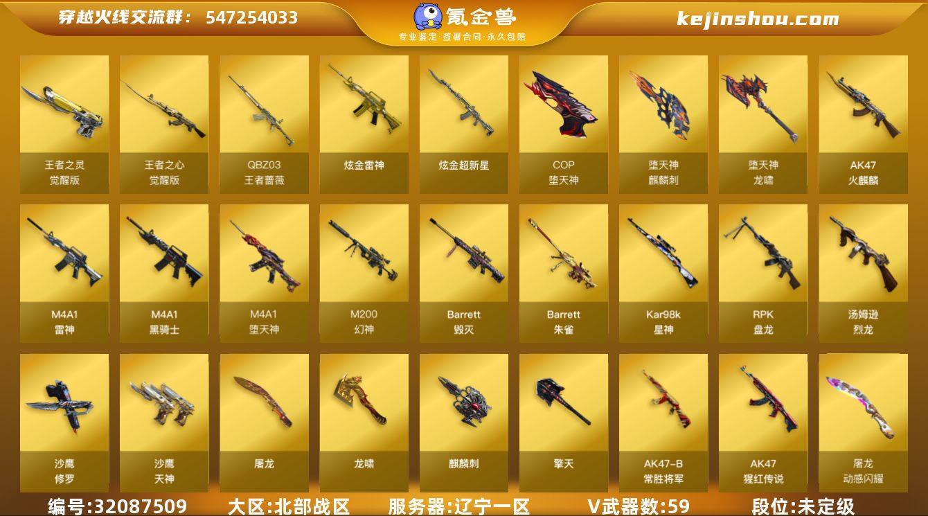 辽宁一区-76V-6王者武器数-2炫金武器数 【热门武器】:M200-幻神,QBZ-03-王者蔷薇,Kar98K-星神,毒蜂,M4A1-黑骑士,汤姆逊-烈龙*6,RPK-盘龙*2,加特林-炼狱*4,斯泰尔-蝴蝶,COP-堕天神*2,沙鹰-修罗*4,金刚伞 【王者炫金武器】:QBZ-03-王者蔷薇,炫金雷神,炫金超新星 【音效卡】:M4A1-黑骑士音效卡 【皮肤】:幻神-电竞之星 皮肤,火麒麟-雷神,火麒麟-平天大圣,毁灭-英雄计划 皮肤,战神-紫绶金章皮肤,AK47-B-常胜将军-曹操,AK47-B-常胜将军-刘备,擎天-秘银 【角色】:葵,樱,魅影,迷迭香,电竞教官-云悠悠,毒蝰术士,王者-瞳-闭月羞花,王者-魅影,王者雾萌萌,空,初恋灵狐,风暴女,零-水下丽影,灵狐者-职业经理,龙儿-小淘气,潘多拉-甜心教官,邱刚敖,斯沃特-X,甜心偶像,蜀雪 【人偶武器】:斯泰尔-蝴蝶,巴雷特-零-水下丽影,迷你生化手雷,生化手雷-机甲核心*2,闪光弹-小乔,闪光弹-貂蝉,高爆手雷-大乔,迷你艾比 【暴走生化】:毒蜂,异变清道夫,超级对讲机 【挑战大师】:冰龙粉碎者-白马银枪,激光毁灭者III,神圣爆裂者-末日III,阐释者III*2 【英雄级武器】:AK47-火麒麟*2,M4A1-雷神,M4A1-黑骑士,M4A1-堕天神,王者之心-觉醒版,AK-47-猩红传说,王者火魄-觉醒版,AK47-B-常胜将军,Barrett-毁灭,M200-幻神,Barrett-朱雀,Kar98K-星神,王者蔷薇-觉醒版,RPK-盘龙*2,加特林-炼狱*4,汤姆逊-烈龙*6,沙鹰-修罗*4,沙鹰-天神,COP-堕天神*2,王者之灵-觉醒版,屠龙,龙啸,麒麟刺-堕天神,擎天,麒麟刺,龙啸-堕天神,王者之锋-觉醒版,高爆手雷-堕天神*6,闪光弹-堕天神*6,烟雾弹-堕天神*6 【道具】:CFS限定背包,炫彩背包,超级背包,绿色巨人,灵魂忍者,变异宝贝,迷雾幽灵,夺命之镰,防化服*2,语音特效-机器人,C4-沙漠,防弹头盔*3,防弹衣*3,C4工具钳*2,手...