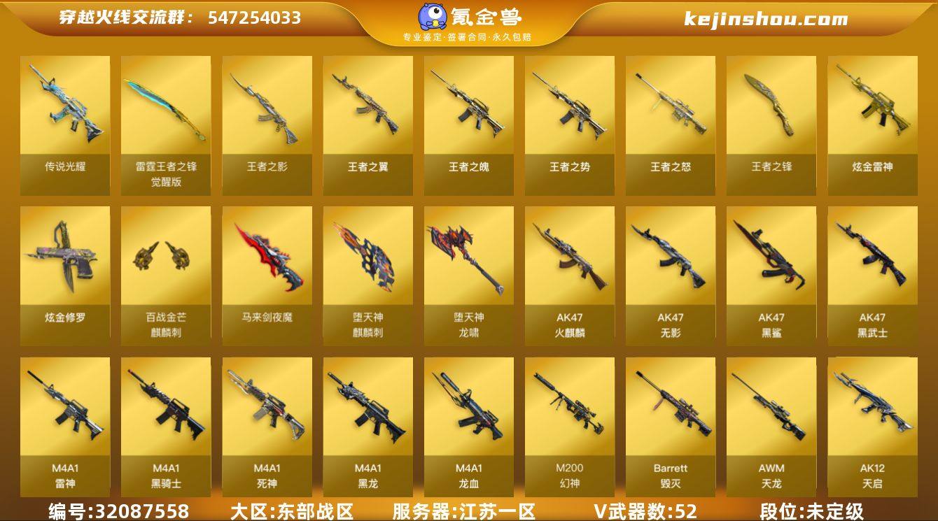 江苏一区-56V-7王者武器数-2炫金武器数 【传说武器】:传说光耀 【热门武器】:传说光耀,M200-幻神,C.A.T,M4A1-黑骑士,汤姆逊-烈龙*2,加特林-炼狱*2,火麒麟-绝迹,沙鹰-修罗*4 【王者炫金武器】:王者之翼,王者之势,王者之影,王者之魄,王者之怒,王者之锋,炫金雷神,炫金修罗 【音效卡】:Barrett-毁灭音效卡 【皮肤】:烈龙-星空,雷神-暗月,雷神-荣耀之魄,火麒麟-华夏之心,火麒麟-心动糖果,毁灭-星空,黑龙-能量核心,战神-粉色甜心皮肤,战神-紫绶金章皮肤*5,战神-流金岁月皮肤*3,AWM-天龙-传奇70KG,修罗耀金皮肤 【角色】:葵,王者-葵-貂蝉,云海玲珑,娟娟,潜龙队-X,斯沃特-X,蜀雪,铁骑荣耀,影武者-X,雅典娜 【人偶武器】:火麒麟-绝迹,C.A.T,闪光弹-小乔 【暴走生化】:超级对讲机 【英雄级武器】:AK47-火麒麟*2,M4A1-黑龙,M4A1-雷神,M4A1-黑骑士,AK47-无影,M4A1-死神,AK47-黑武士,AK12-天启,AK47-黑鲨*3,M4A1-龙血,AK-47-猩红传说,AK47-B-战神,黑武士-CF网剧冠军,AWM-天龙,Barrett-毁灭,M200-幻神,王者幻神-觉醒版,加特林-炼狱*2,汤姆逊-烈龙*2,沙鹰-修罗*4,天神-CF网剧冠军,屠龙,龙啸,麒麟刺-堕天神,马来剑-夜魔,擎天,麒麟刺,龙啸-堕天神,擎天-CF网剧冠军,高爆手雷-雷霆,高爆手雷-堕天神,高爆手雷-夜魔,闪光弹-雷霆,闪光弹-堕天神,闪光弹-夜魔,烟雾弹-雷霆,烟雾弹-堕天神,烟雾弹-夜魔 【道具】:战舰背包,炫彩背包,超级背包,变异宝贝,夺命之镰,防化服,C4-沙漠,防弹头盔*3,防弹衣*3,C4工具钳*3,手雷包*3 【特殊枪械】:1黑骑士,2烈龙,2炼狱