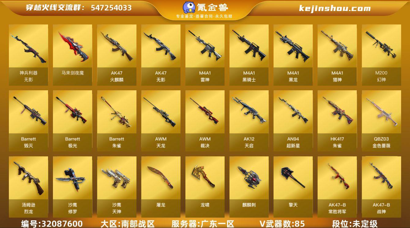 广西一区-93V-15王者武器数-0炫金武器数 【热门武器】:QBZ03-金色蔷薇*3,HK417-朱雀,M200-幻神,M4A1-黑骑士,汤姆逊-烈龙*6,加特林-炼狱*2,羊驼玩偶,火麒麟-绝迹,COP-白鲨,COP 357-雷霆王者,沙鹰-修罗*4,金刚伞 【王者炫金武器】:COP 357-雷霆王者,王者之魄高爆手雷,王者之魄闪光弹*4,王者之魄烟雾弹*2 【音效卡】:AK47-火麒麟音效卡,M4A1-雷神音效卡,M4A1-黑骑士音效卡,Barrett-毁灭音效卡,Barrett-极光音效卡,枪娘语音包-阿敏,Barrett-碧霄极光音效卡,炼狱-百战金芒-庆典舞曲音效卡 【皮肤】:幻神-荣耀世冠EP 皮肤,金色蔷薇-枪娘阿敏 皮肤,QBZ03-荣耀世冠EP 皮肤,裁决-叶芒苍灵 皮肤,烈龙-星空,雷神-暗月,雷神-虎将,雷神-耀金皮肤,M4A1-再燃火线,AK47-火麒麟-传奇EVEN,火麒麟-平天大圣,火麒麟-百城,火麒麟-心动糖果,火麒麟-玉面羞花 皮肤,毁灭-暗月,毁灭耀金皮肤,毁灭-战神张飞,M4A1-千变-孔明皮肤,黑龙-暗月*2,黑骑士-暗月,战神-粉色甜心皮肤*2,战神-紫绶金章皮肤*2,战神-流金岁月皮肤*2,AK47-B-常胜将军-刘备,AK47-B-常胜将军-孙权,极光-能量核心,极光-高能霹雳 皮肤,炼狱-月 皮肤,修罗耀金皮肤,轻型军用手斧-再燃火线,麒麟刺-月皮肤 【角色】:炫,枪娘樱,王者春,王者玲珑-小乔,乔伊教练,炽天使,暗夜-X,风暴女,虎妞,嘉年华灵狐,娟娟,灵狐-花神,灵狐者-X,灵狐者-黄金海岸,龙儿,麻雀,曼陀罗-X,曼陀罗-礼服,潘多拉-X,潘多拉-甜心教官,邱刚敖,青霞仙子,斯沃特-X,蜀雪,铁骑荣耀,雪莉杨,雪莉杨-摸金校尉,影武者-X 【人偶武器】:火麒麟-绝迹,COP-白鲨,街机小灰机,AWM-灵狐-15周年嘉年华,迷你牛牛,迷你生化手雷*2,生化手雷-机甲核心,深渊终结者手雷,闪光弹-小乔,闪光弹-貂蝉,高爆手雷-大乔 【暴走生化】:黑龙吞噬者 【...