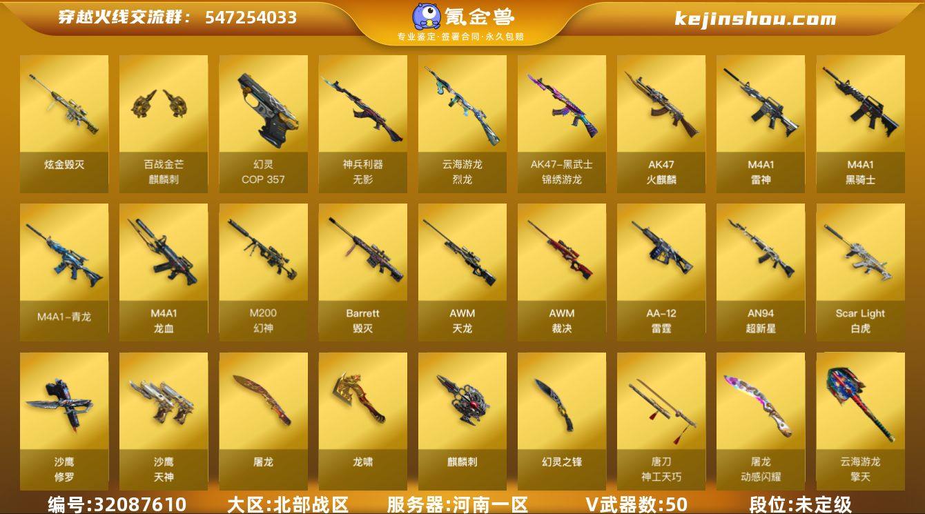 河南一区-52V-0王者武器数-1炫金武器数 【热门武器】:Scar Light-白虎,M4A1-青龙,M200-幻神,M4A1-黑骑士,COP 357-幻灵*2,沙鹰-修罗 【王者炫金武器】:炫金毁灭 【音效卡】:Scar Light-白虎音效卡,Barrett-碧霄极光音效卡,炼狱-百战金芒-庆典舞曲音效卡 【皮肤】:幻神-动感闪耀 皮肤,白虎-百战金芒 皮肤,裁决-运输船 皮肤,雷神-暗月,M4A1-战神赵云,雷神-R.LGD-CFPLS18冠军,M4A1-再燃火线,火麒麟-雷神,火麒麟-心动糖果,毁灭-暗月,毁灭-英雄计划 皮肤,黑骑士-暗月,屠龙-惊鸿 皮肤,轻型军用手斧-再燃火线 【角色】:战地猎狐,王者潘多拉,蛇隐宗,奇洋探员,乔伊教练,云海玲珑,暗夜-X,北极狐-X,初恋灵狐,风暴女,虎妞,嘉年华灵狐,疾风,灵狐者-X,龙儿,潘多拉-X,青霞仙子,蛇姬,斯沃特-X,新娜塔莎 【人偶武器】:迷你深渊冰龙,迷你波特博士,夺魂,生化手雷-机甲核心,深渊终结者手雷,AK12-夜玫瑰 【暴走生化】:超级对讲机 【挑战大师】:冰龙粉碎者-白马银枪,激光毁灭者III-白马银枪,激光毁灭者III 【英雄级武器】:AK47-火麒麟*2,M4A1-雷神*3,M4A1-黑骑士,AN94-超新星,M4A1-龙血,M4A1-青龙,Scar Light-白虎,无影-神兵利器,黑武士-锦绣游龙,AWM-天龙,Barrett-毁灭,AWM-裁决,M200-幻神,炼狱-百战金芒,烈龙-云海游龙,AA-12-雷霆,沙鹰-修罗,沙鹰-天神,COP 357-幻灵*2,屠龙,龙啸,麒麟刺,幻灵之锋*2,唐刀-神工天巧,擎天-云海游龙,麒麟刺-百战金芒,丛林匕首-玄豹,高爆手雷-幻灵,手雷-云海游龙,高爆手雷-古蛇迷踪,高爆手雷-玄豹,闪光弹-幻灵,闪光弹-神工天巧,闪光弹-玄豹*2,烟雾弹-幻灵*2,烟雾弹-玄豹,M4A1-赤狱骑士,M4A1-苍鸣雷神,Barrett-碧霄极光 【道具】:BS战队炫彩背包,CFS限定背包,云海游龙炫彩背包,亚洲杯纪念炫彩背包,全能枪...
