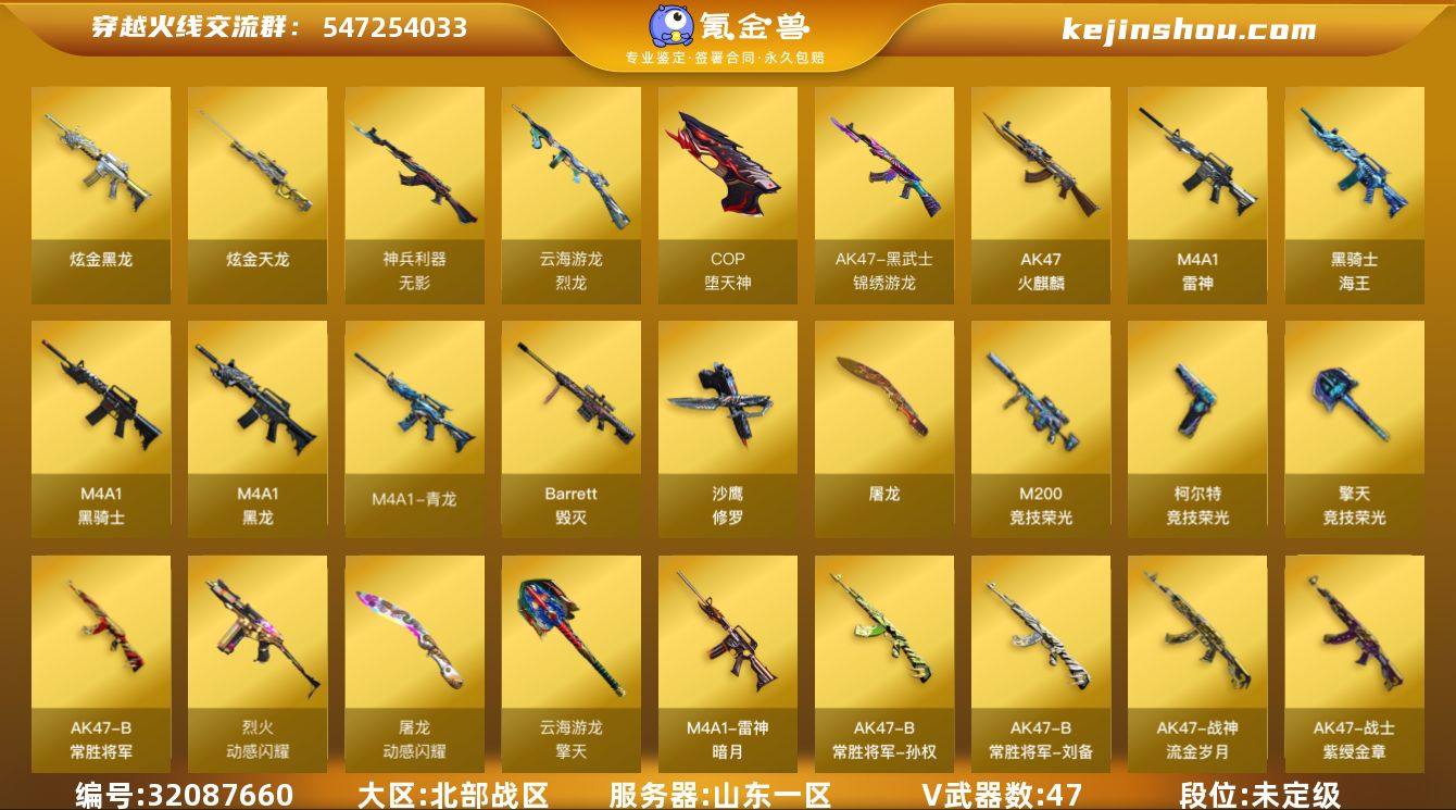 山东一区-50V-7王者-2炫金 【热门武器】:M4A1-青龙,M200-竞技荣光,M4A1-黑骑士,COP-堕天神,沙鹰-修罗 【王者炫金武器】:炫金黑龙,炫金天龙 【音效卡】:烈龙-云海游龙音效卡,擎天-云海游龙音效卡,M4A1-雷神音效卡,M4A1-黑骑士音效卡,Barrett-毁灭音效卡 【皮肤】:裁决-过载 皮肤,雷神-暗月,雷神-杨戬,雷神-烈虎皮肤,雷神-源计划2.0专属 皮肤,火麒麟-心动糖果,毁灭-CFS2020,毁灭-英雄计划 皮肤,战神-紫绶金章皮肤,战神-流金岁月皮肤,AK47-B-常胜将军-刘备,AK47-B-常胜将军-孙权*2,屠龙-春桃 皮肤,龙啸-巅峰荣耀 皮肤 【角色】:电竞教官-云悠悠,荒漠琉璃,王者炫,王者沙漠玫瑰,乔伊教练,云海玲珑,暗夜-X,北极狐-X,风暴女,嘉年华灵狐,兰-新年限定,灵狐者-X,麻雀,曼陀罗-X,潘多拉-X,潘多拉-甜心教官,斯沃特-X,甜心偶像,雪莉杨,职业选手 【人偶武器】:迷你宝贝,Barrett-云海玲珑,AWM-灵狐-15周年嘉年华,生化手雷-机甲核心,闪光弹-貂蝉,高爆手雷-大乔,灵狐娃娃手雷 【暴走生化】:超级对讲机 【挑战大师】:激光毁灭者III-白马银枪 【英雄级武器】:AK47-火麒麟*2,M4A1-黑龙,M4A1-雷神,M4A1-黑骑士,M4A1-青龙,无影-神兵利器,黑武士-锦绣游龙,烈火-动感闪耀,王者之势-觉醒版,黑骑士-海王,AK47-B-常胜将军,M4A1-雷霆王者-觉醒版,Barrett-毁灭,M200-竞技荣光,烈龙-云海游龙,沙鹰-修罗,COP-堕天神,柯尔特-竞技荣光*2,天神-动感闪耀,屠龙,擎天-竞技荣光*2,屠龙-动感闪耀,擎天-云海游龙,王者之啸-觉醒版,王者之击-觉醒版*3,高爆手雷-竞技荣光*3,手雷-动感闪耀,手雷-云海游龙,闪光弹-幻灵,闪光弹-竞技荣光*3,闪光弹-神工天巧,烟雾弹-竞技荣光*3,烟雾弹-神工天巧,烟雾弹-雷霆王者-觉醒版,M4A1-赤狱骑士 【道具】:CFS限定背包,云山科技...